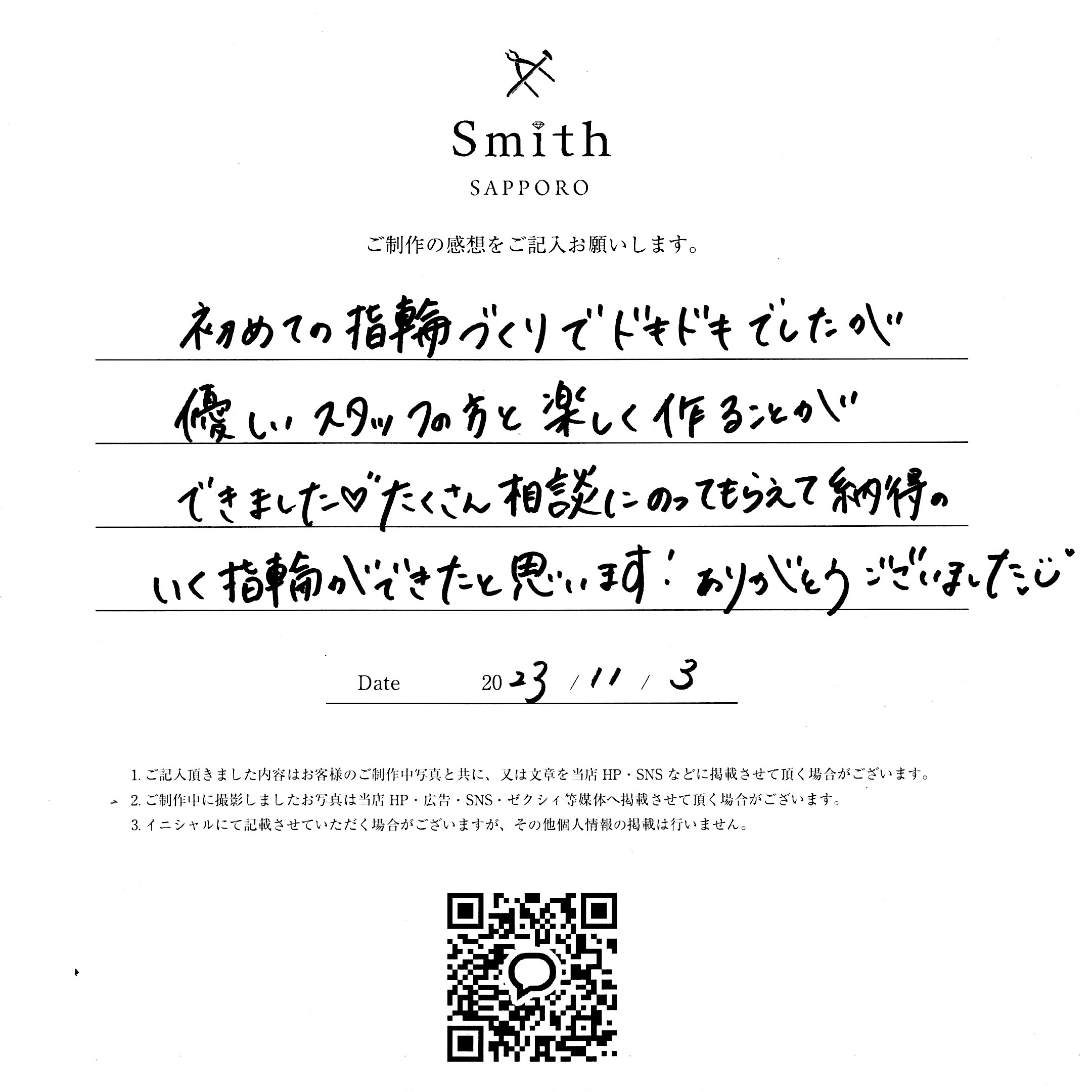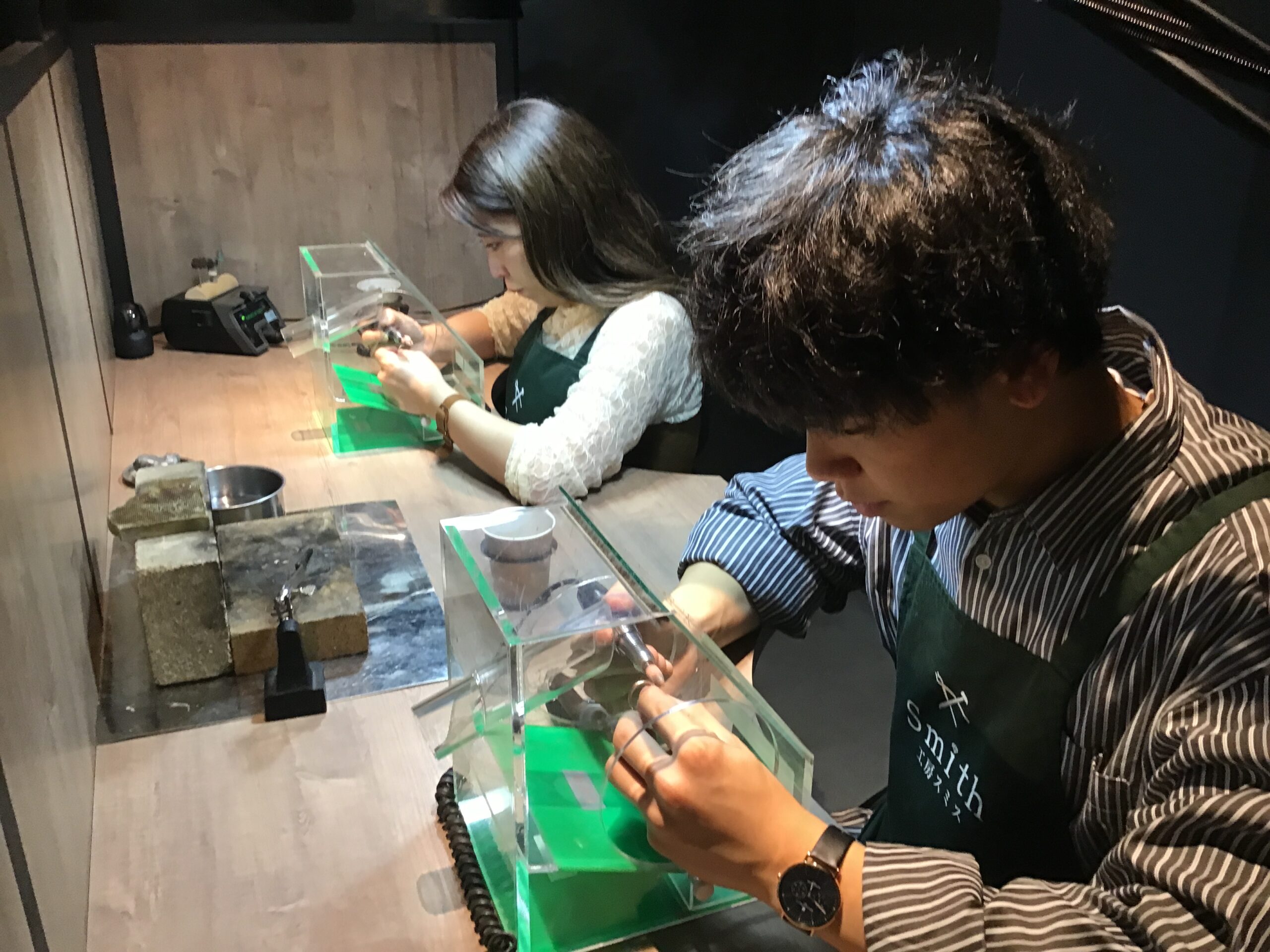 初めての指輪作りでドキドキでしたが優しいスタッフの方と楽しく作る事ができました。
