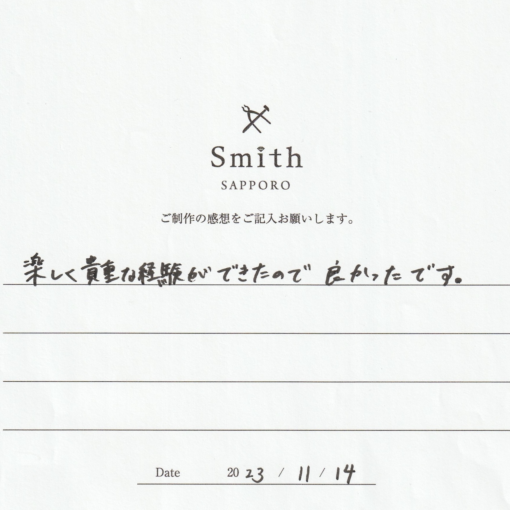 この度は、工房Smith京王プラザホテル札幌店で手作りペアリングのご制作誠にありがとうございました。