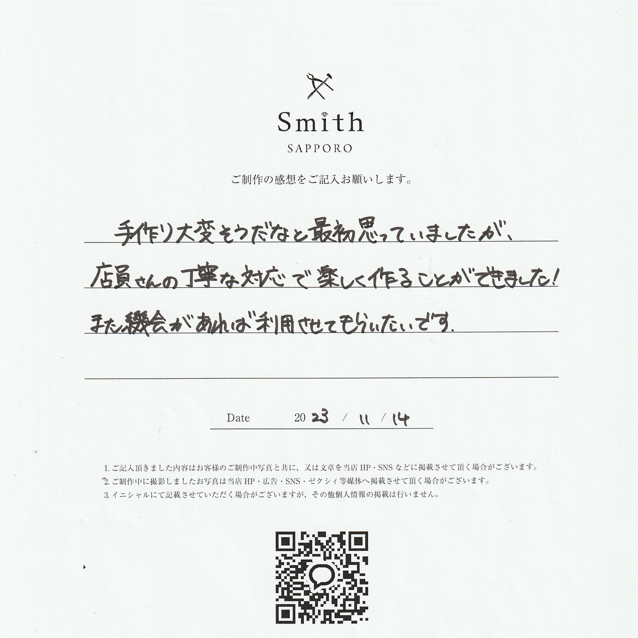 この度は手作りペアリングのご制作に工房スミスにご来店いただき、誠にありがとうございました。