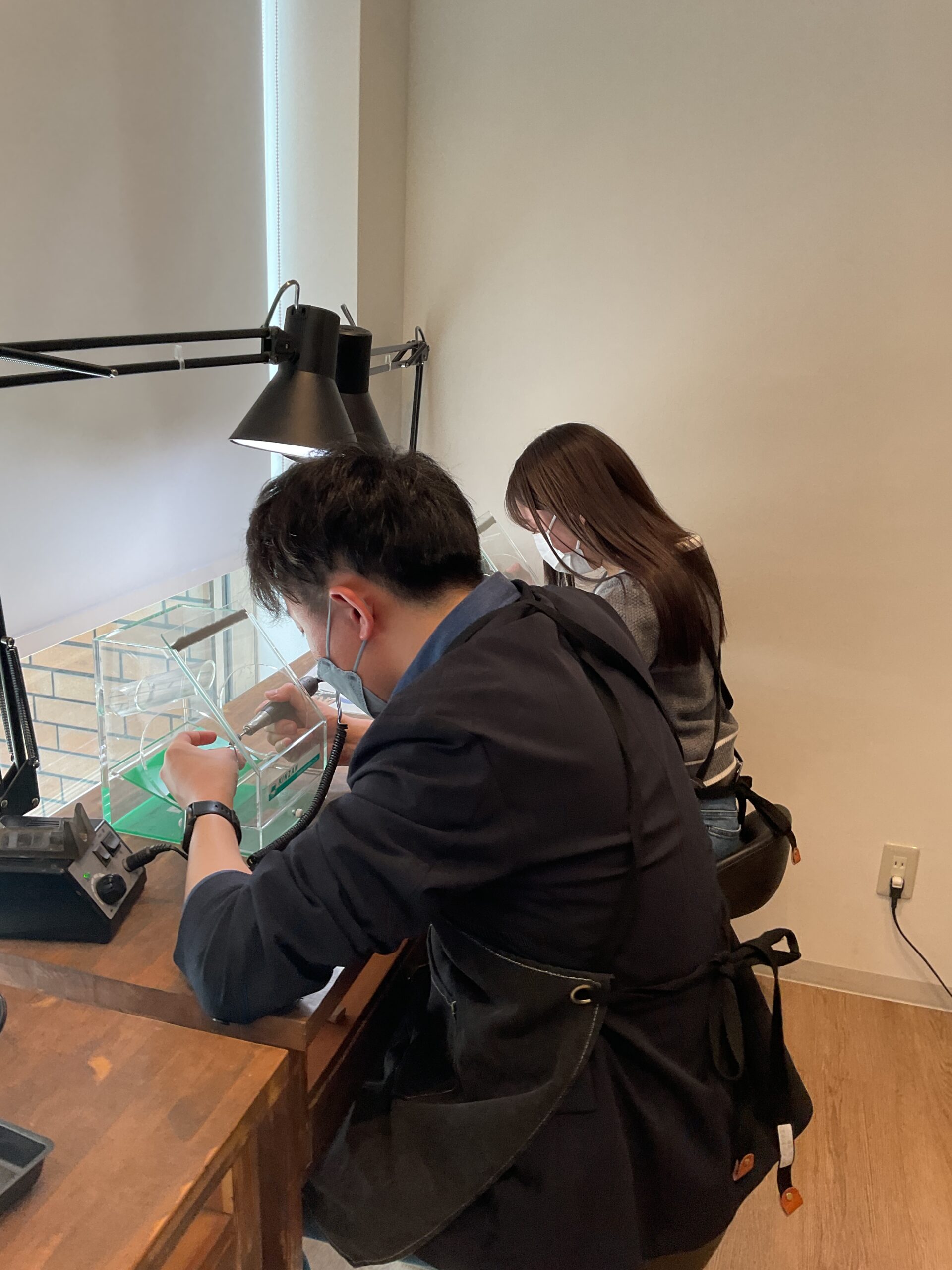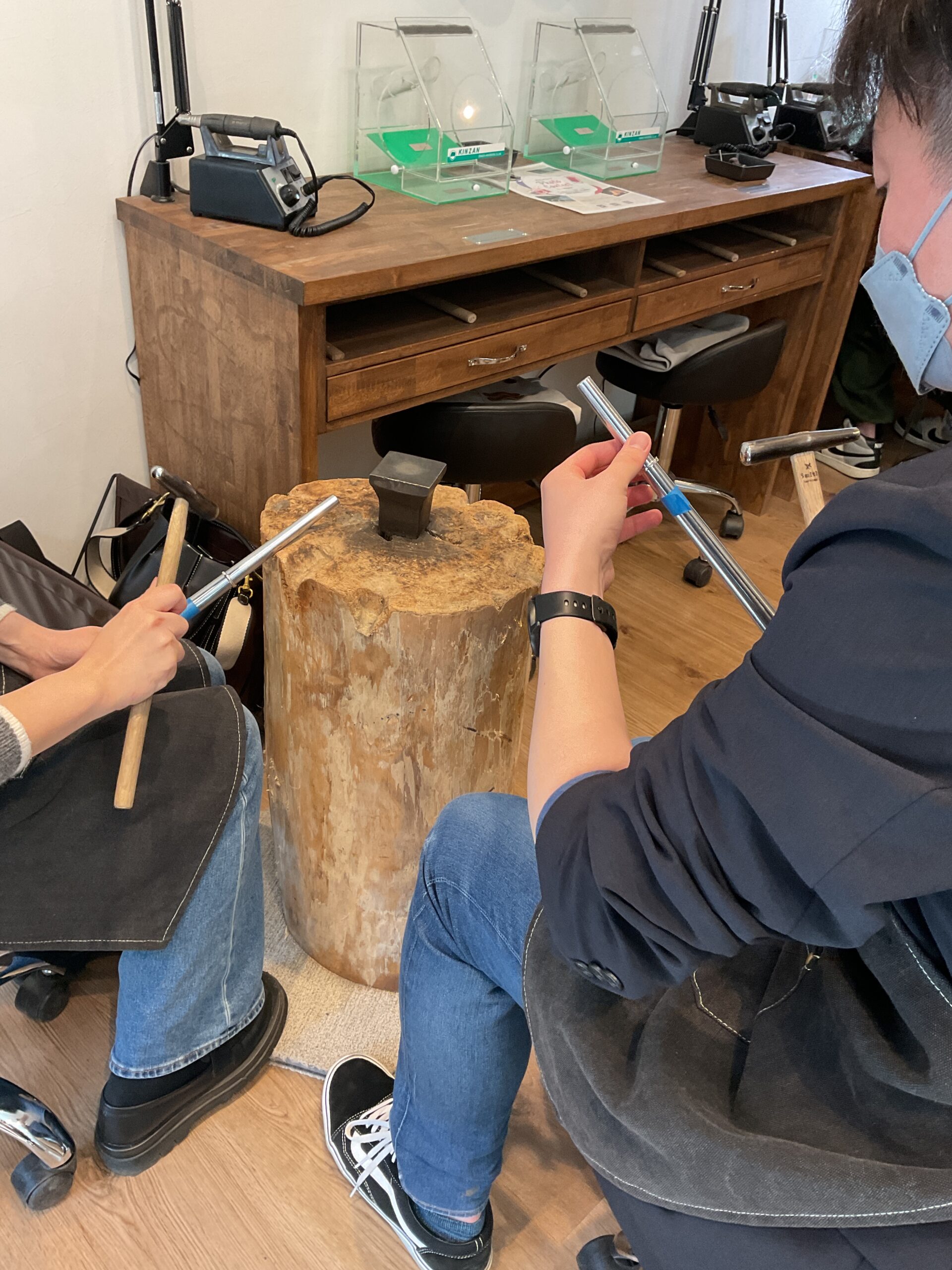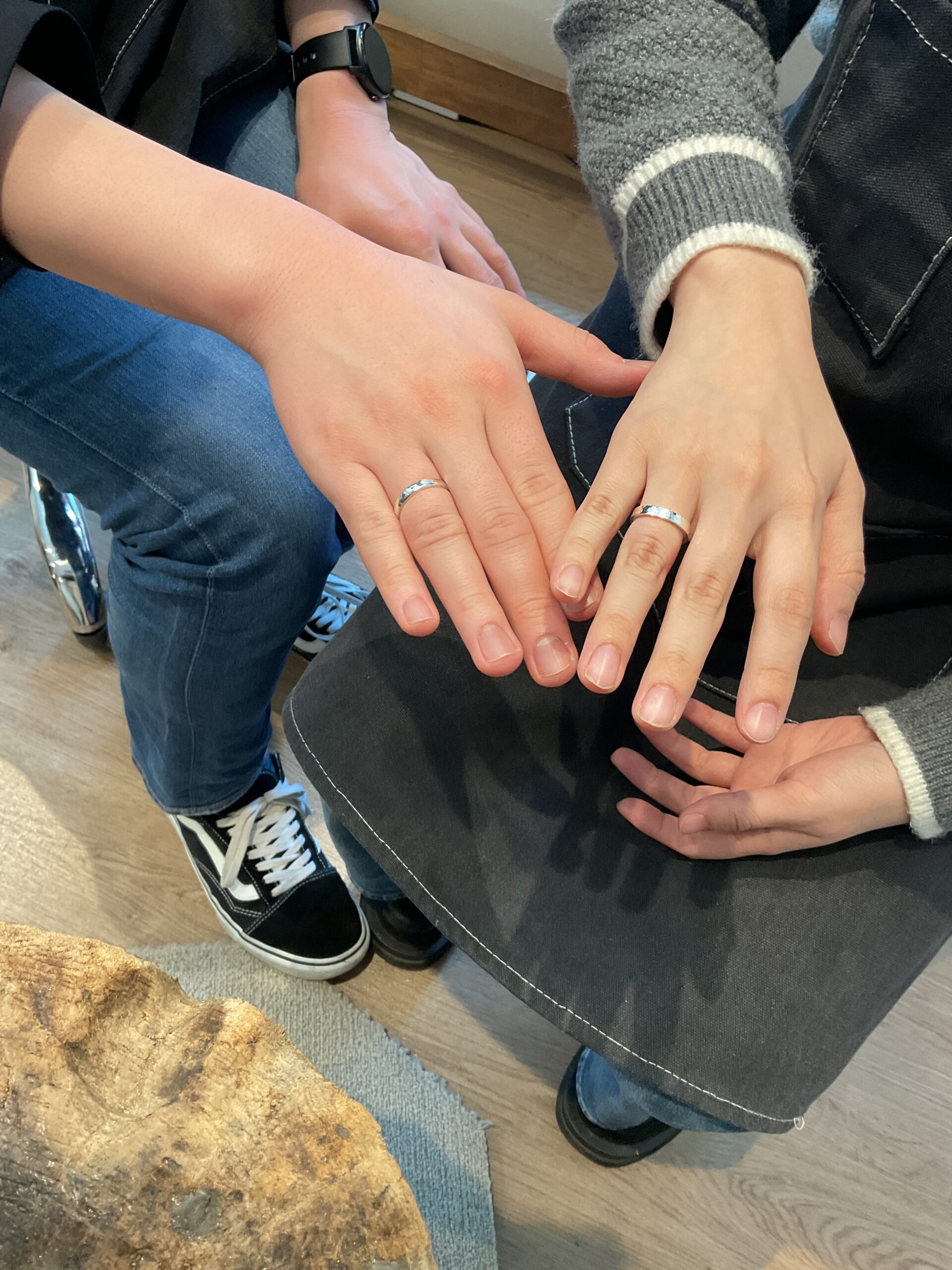 お二人が制作されたリングは、鏡面ハンマーのテクスチャーが輝くお揃いの素敵なペアリングになりました。
