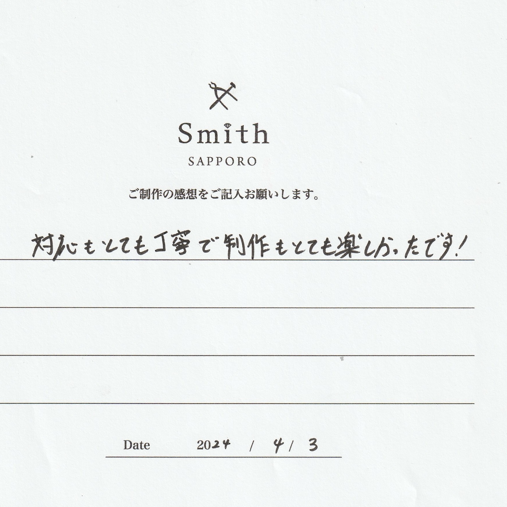 この度は、工房Smith京王プラザホテル札幌店で手作りペアリングのご制作誠にありがとうございました。