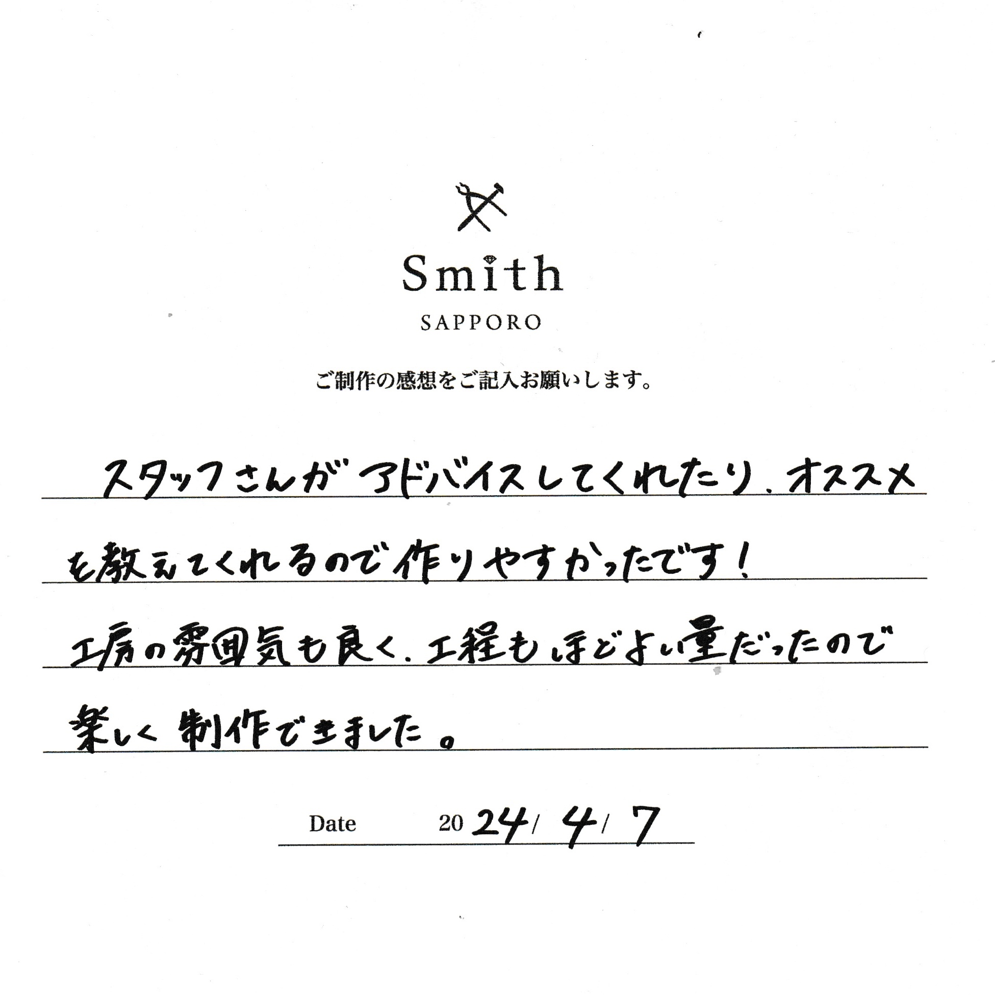 この度は、工房Smith京王プラザホテル札幌店で手作りペアリングのご制作誠にありがとうございました。