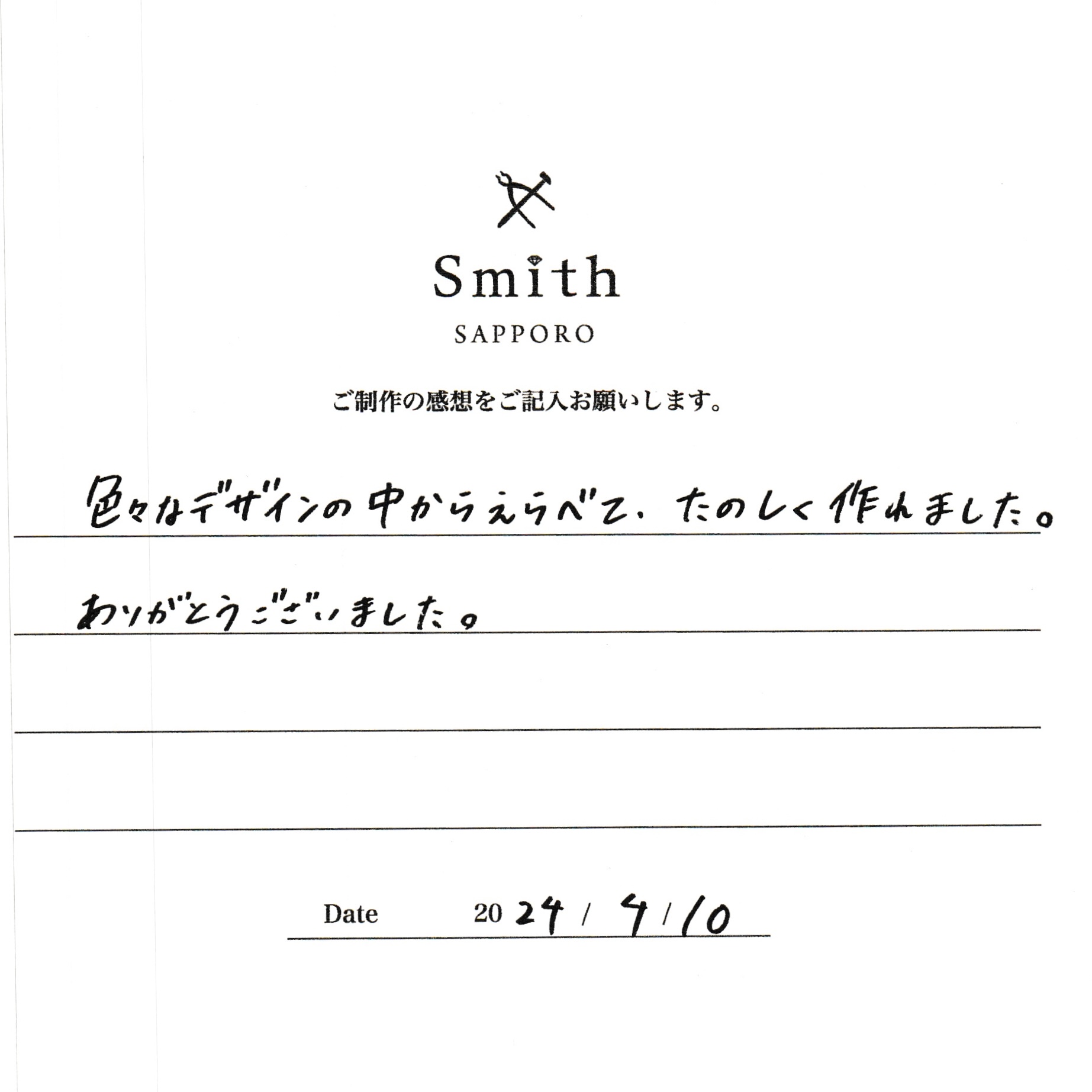 この度は、工房Smith京王プラザホテル札幌店で 手作りペアリングのご制作誠にありがとうございました。