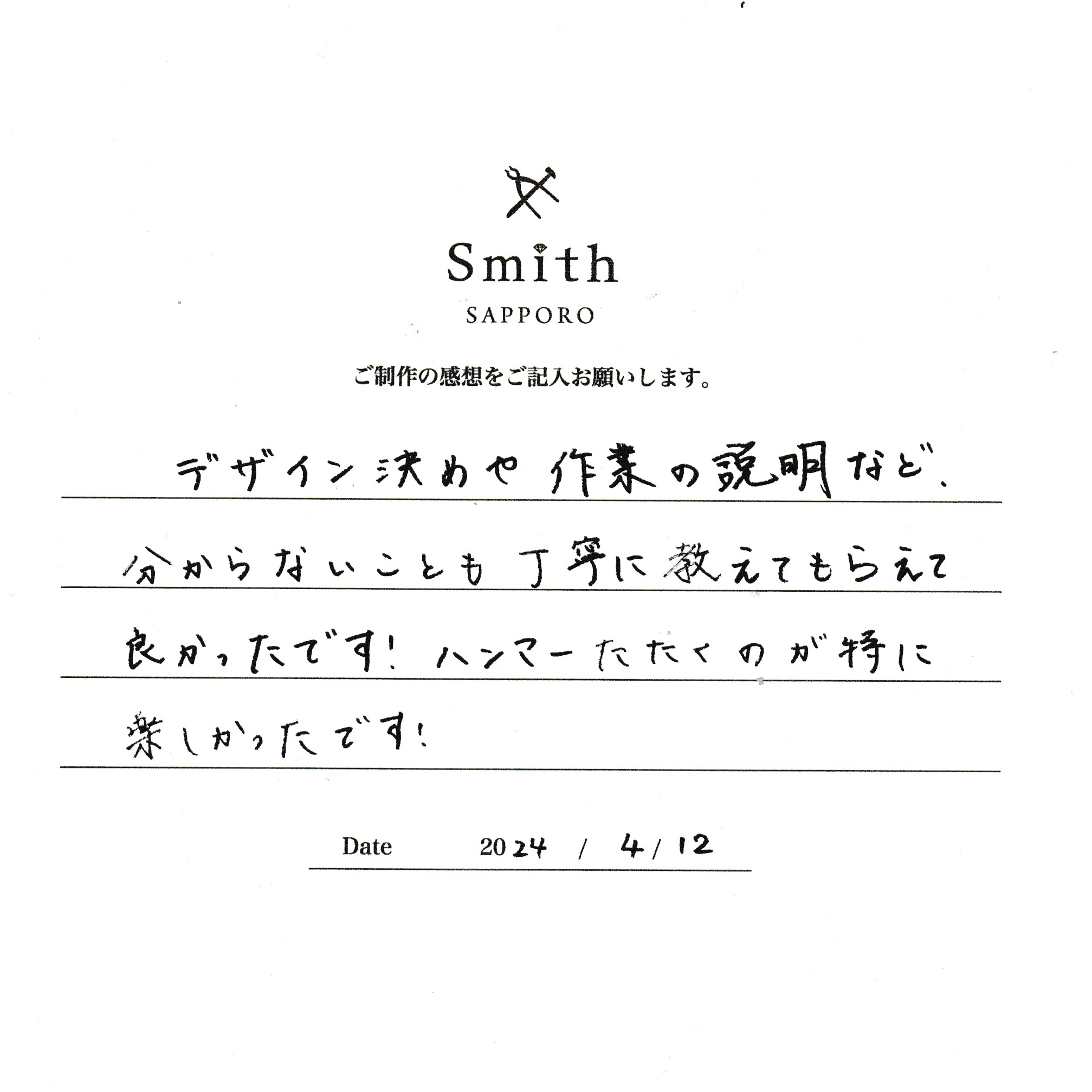 この度は、工房Smith京王プラザホテル札幌店で手作りペアリングのご制作誠にありがとうございました。