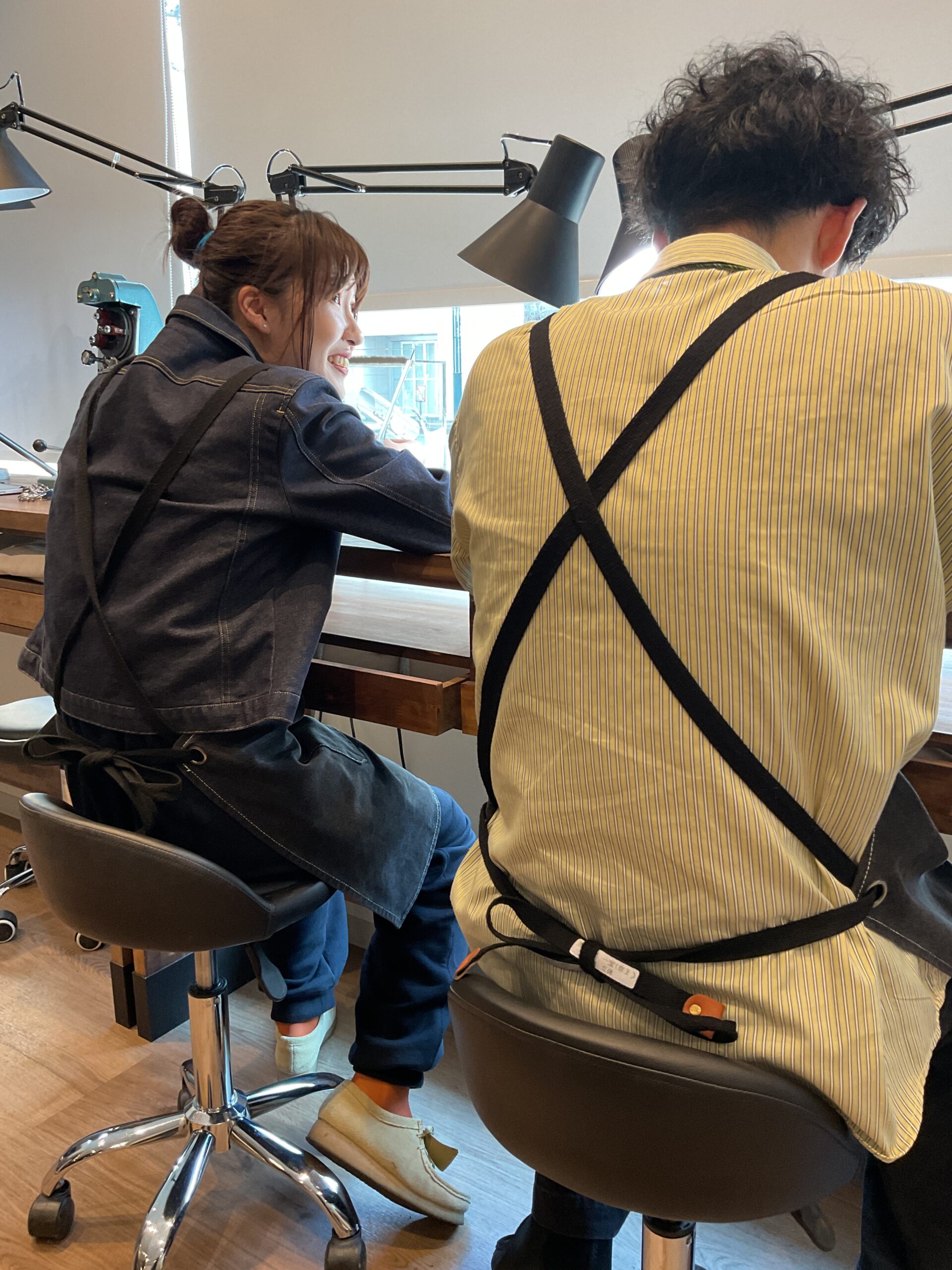 お二人が一生懸命制作されたリングは、鏡面輝くハンマー模様がお揃いのペアリングになりました。