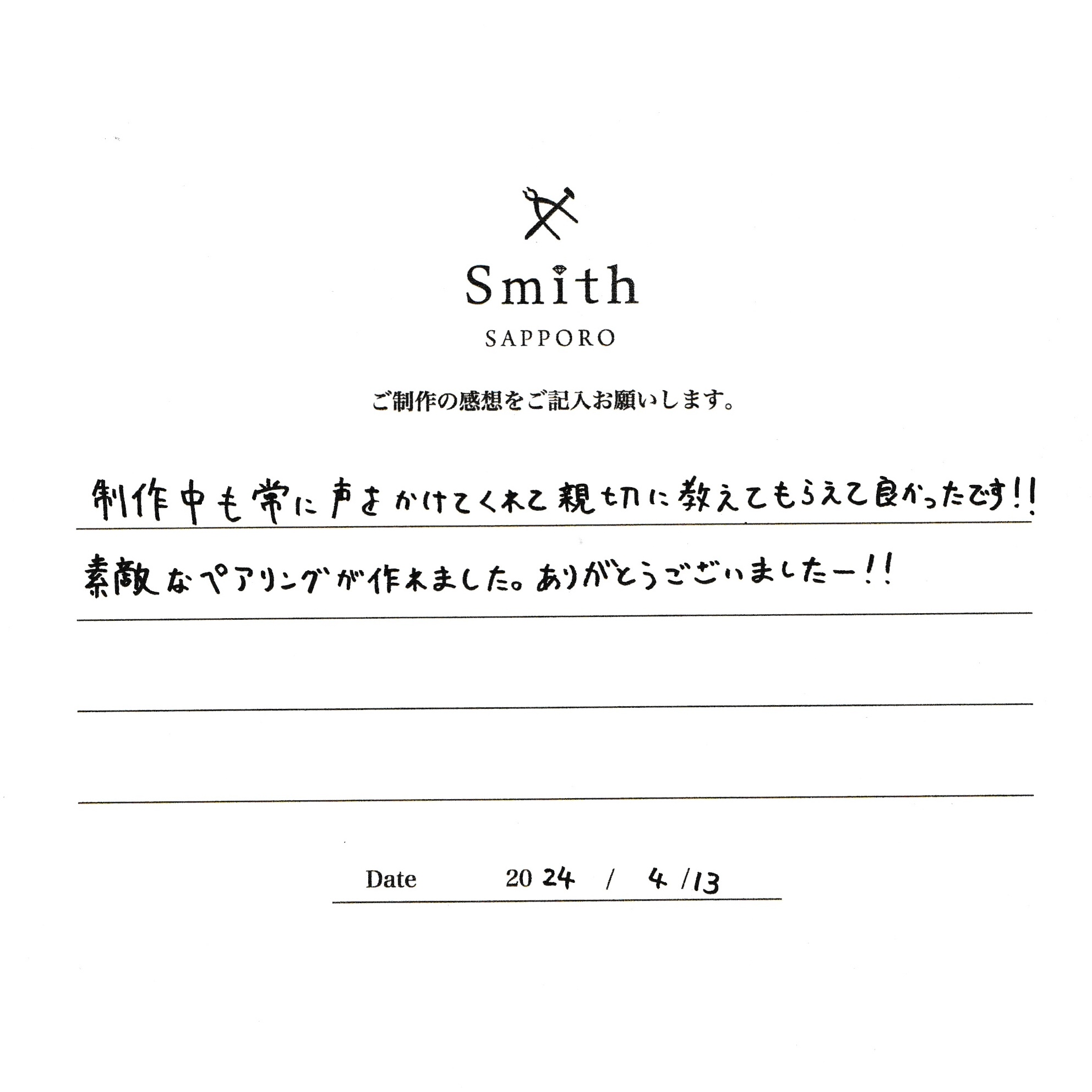この度は、工房Smith京王プラザホテル札幌店で手作りペアリングのご制作誠にありがとうございました。