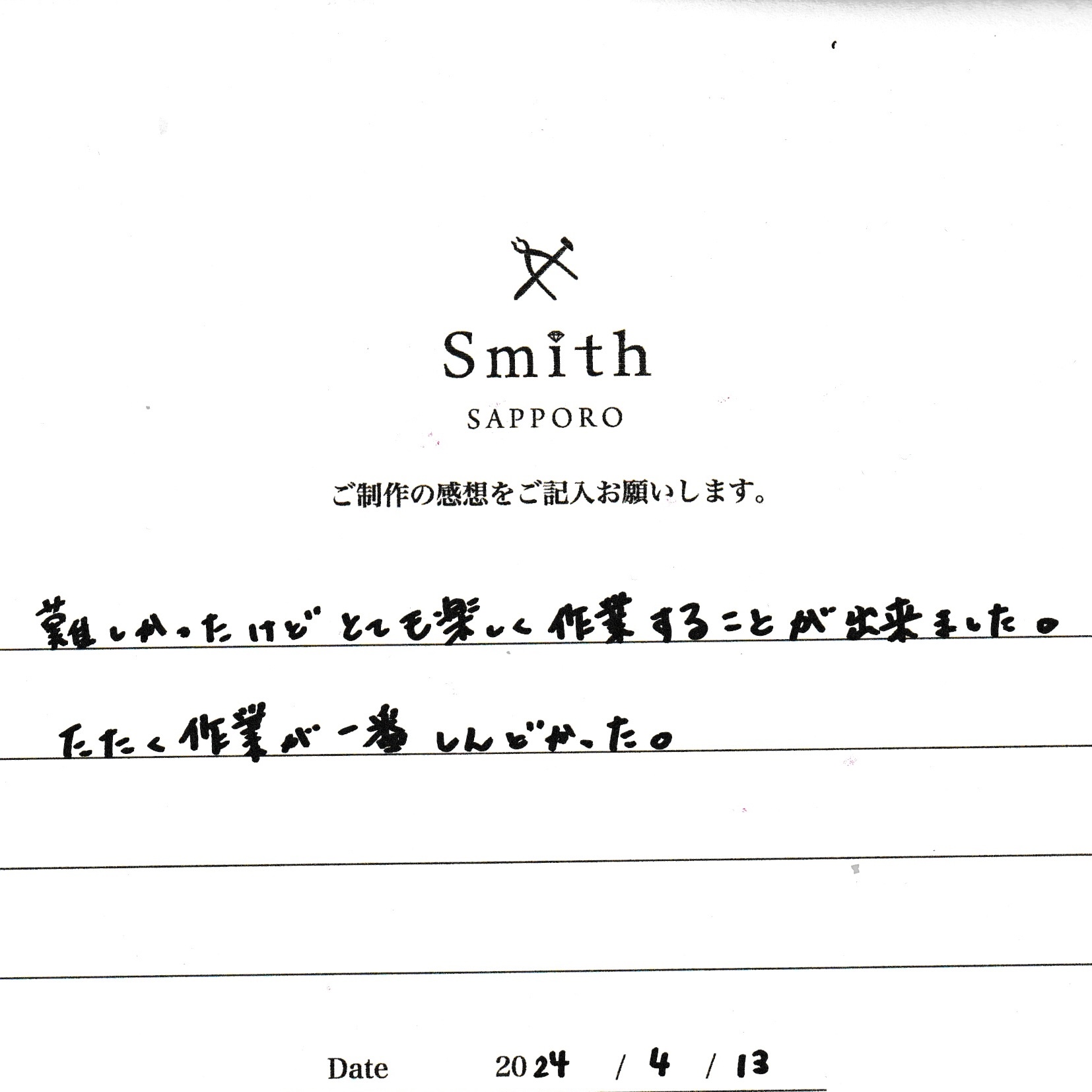 この度は、工房Smith京王プラザホテル札幌店で手作りペアリングのご制作誠にありがとうございました。