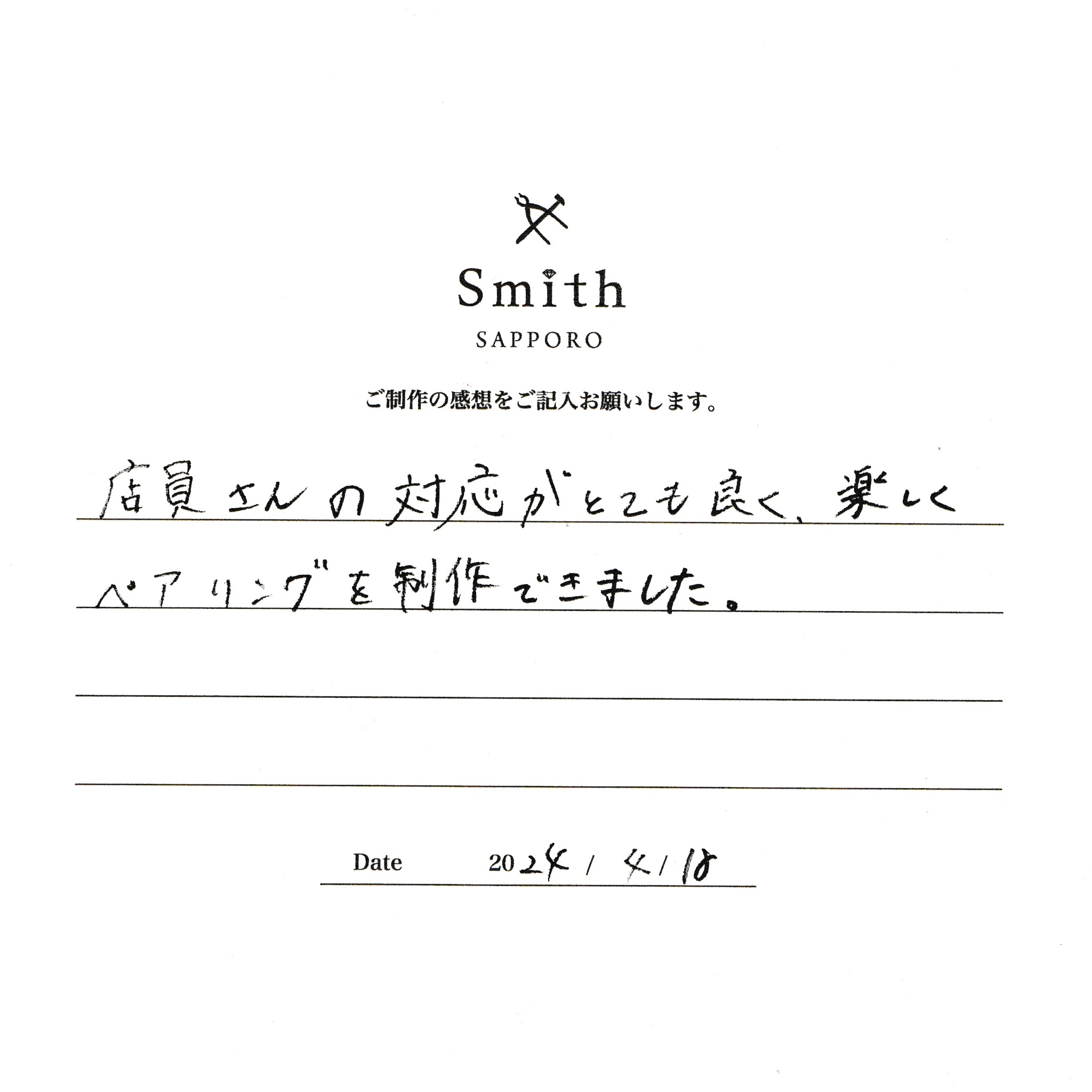 この度は、工房Smith京王プラザホテル札幌店で手作りペアリングのご制作誠にありがとうございました。