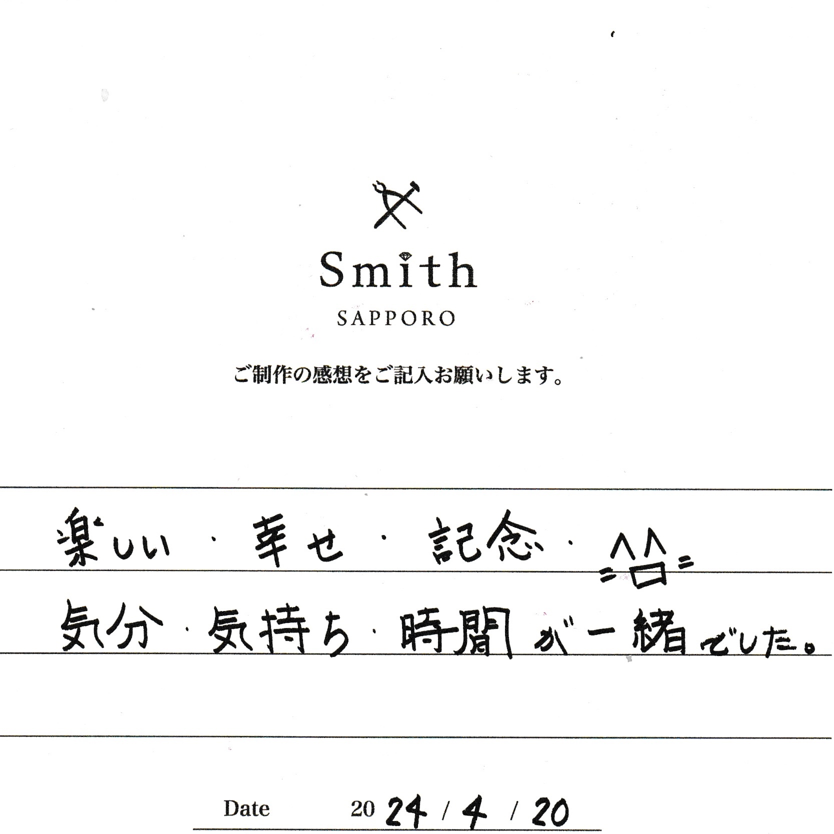 この度は、工房Smith京王プラザホテル札幌店で手作りペアリングのご制作誠にありがとうございました。