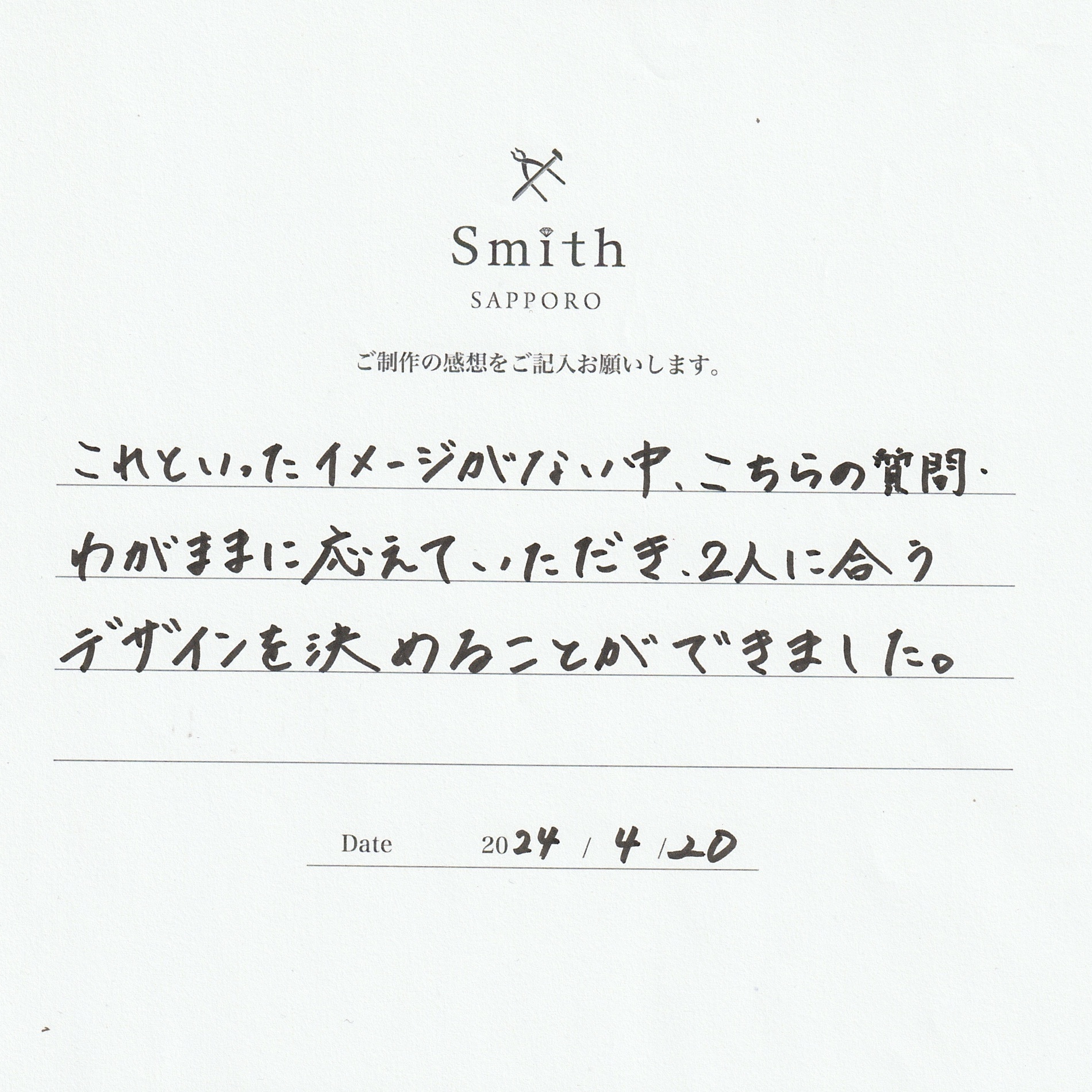 この度は手作り結婚指輪のご制作に工房スミス札幌店にお越しいただき、誠にありがとうございました。