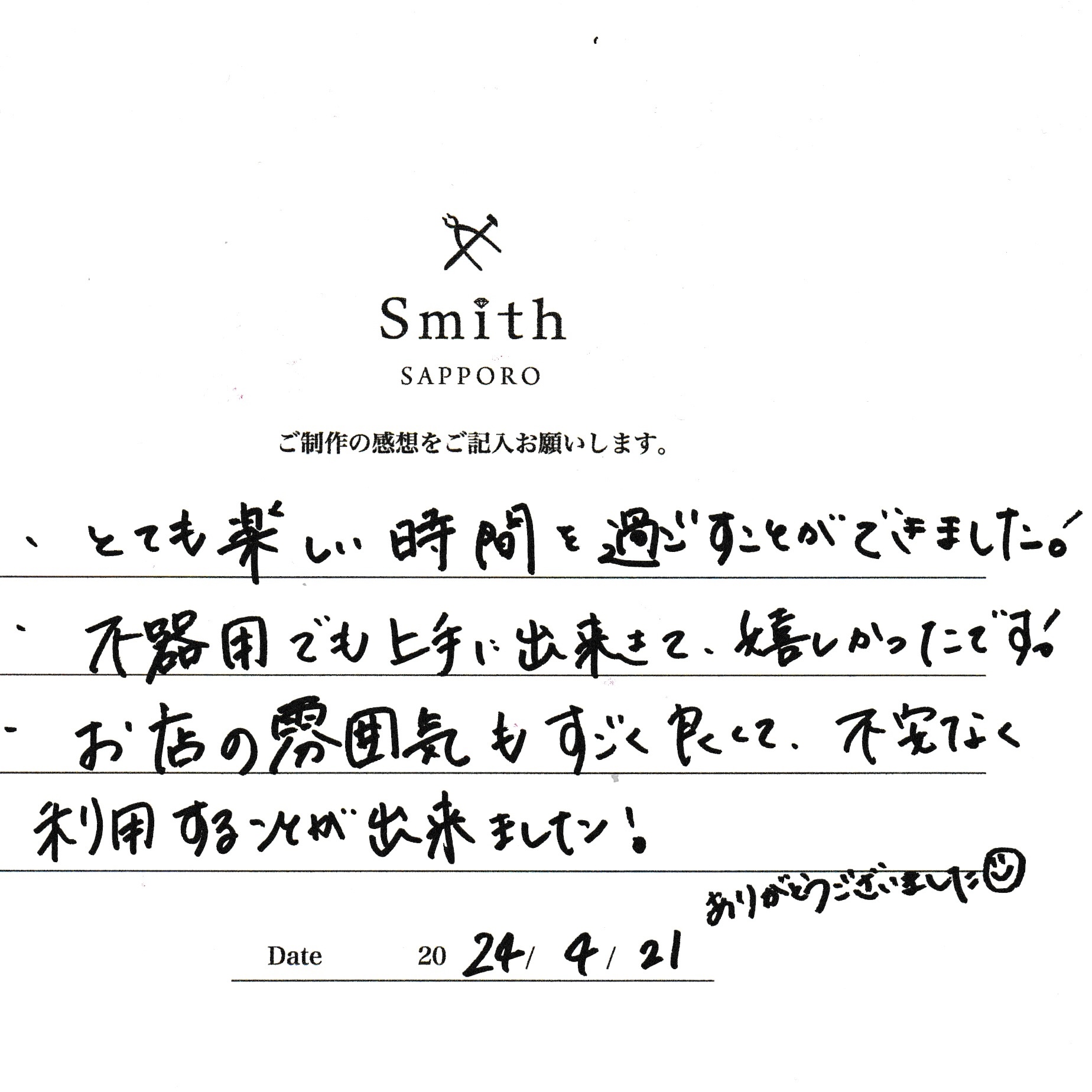 この度は、工房Smith京王プラザホテル札幌店で手作りペアリングのご制作誠にありがとうございました。