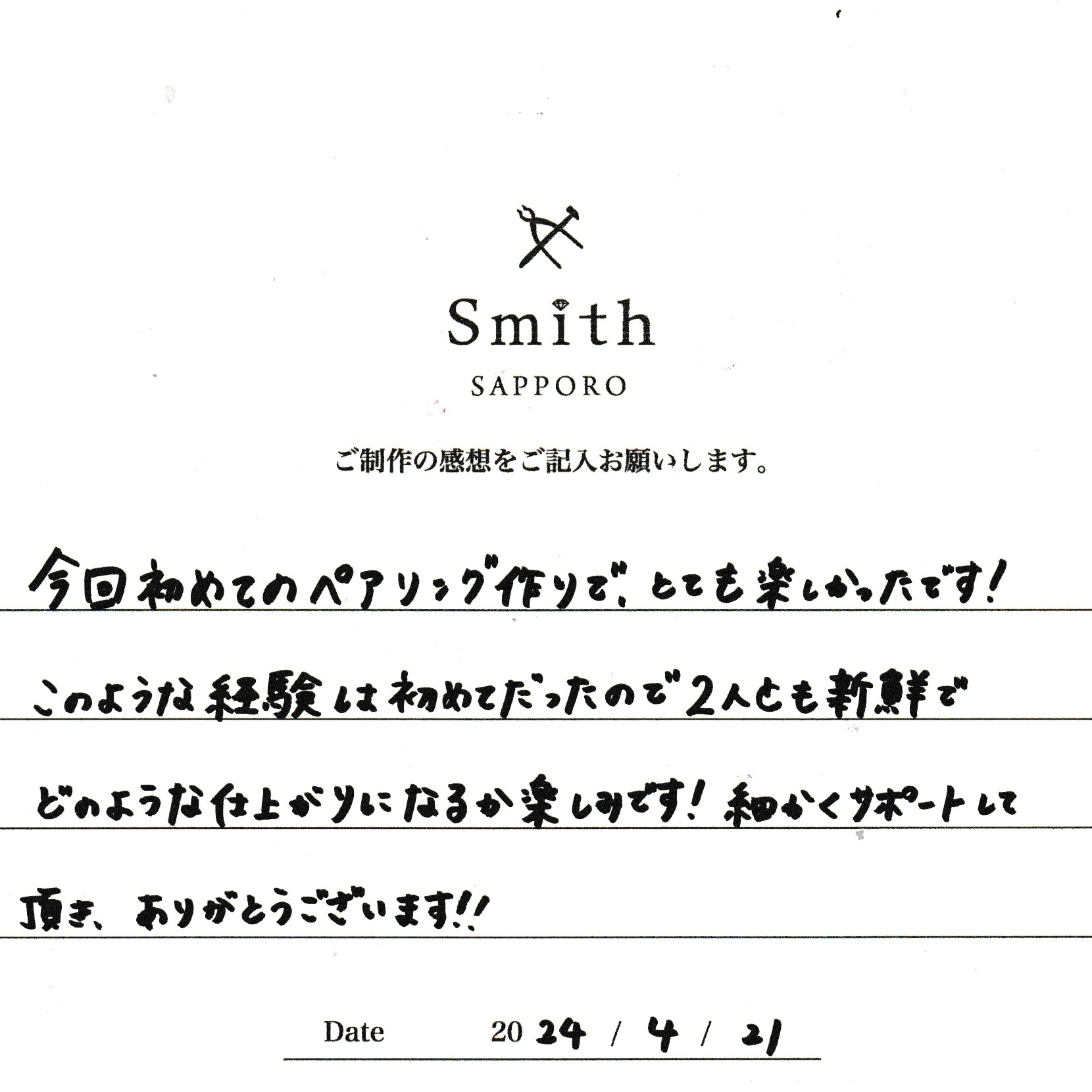 この度は、工房Smith京王プラザホテル札幌店で手作りペアリングのご制作誠にありがとうございました。
