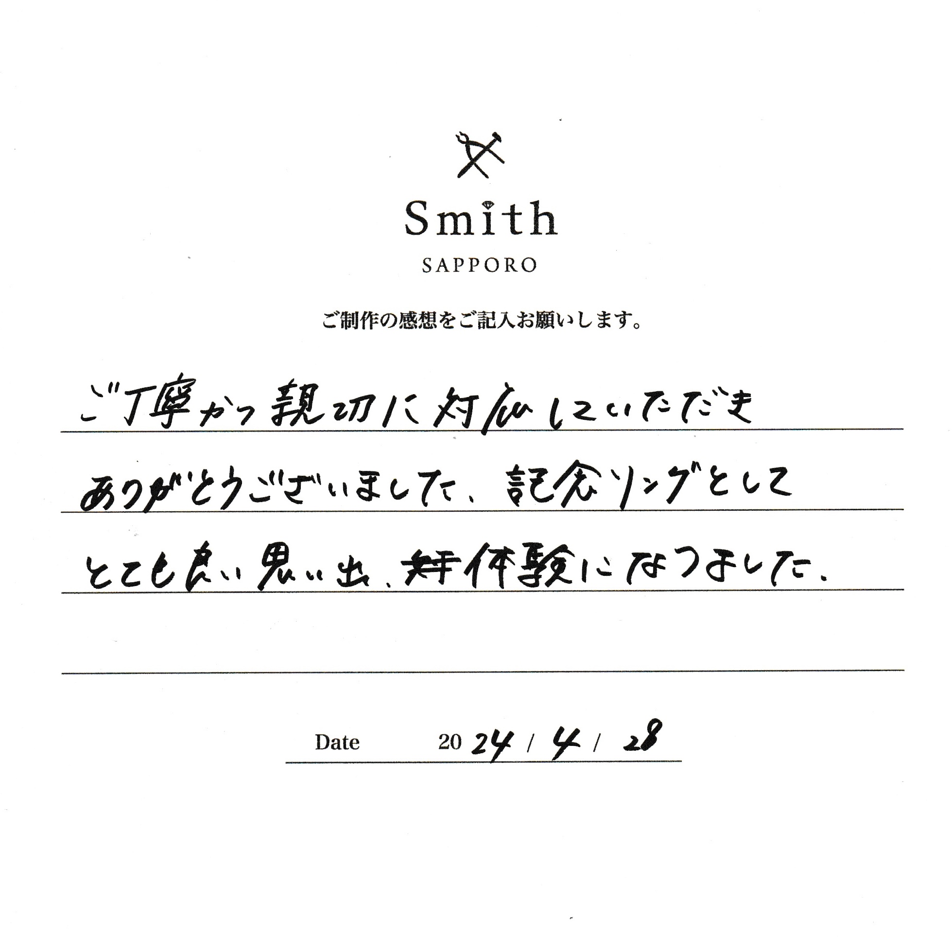 この度は、工房Smith京王プラザホテル札幌店で手作りペアリングのご制作 誠にありがとうございました。