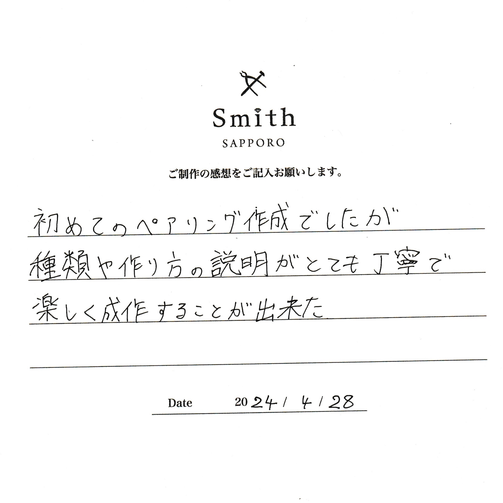 この度は、工房Smith京王プラザホテル札幌店で手作りペアリングのご制作 誠にありがとうございました。