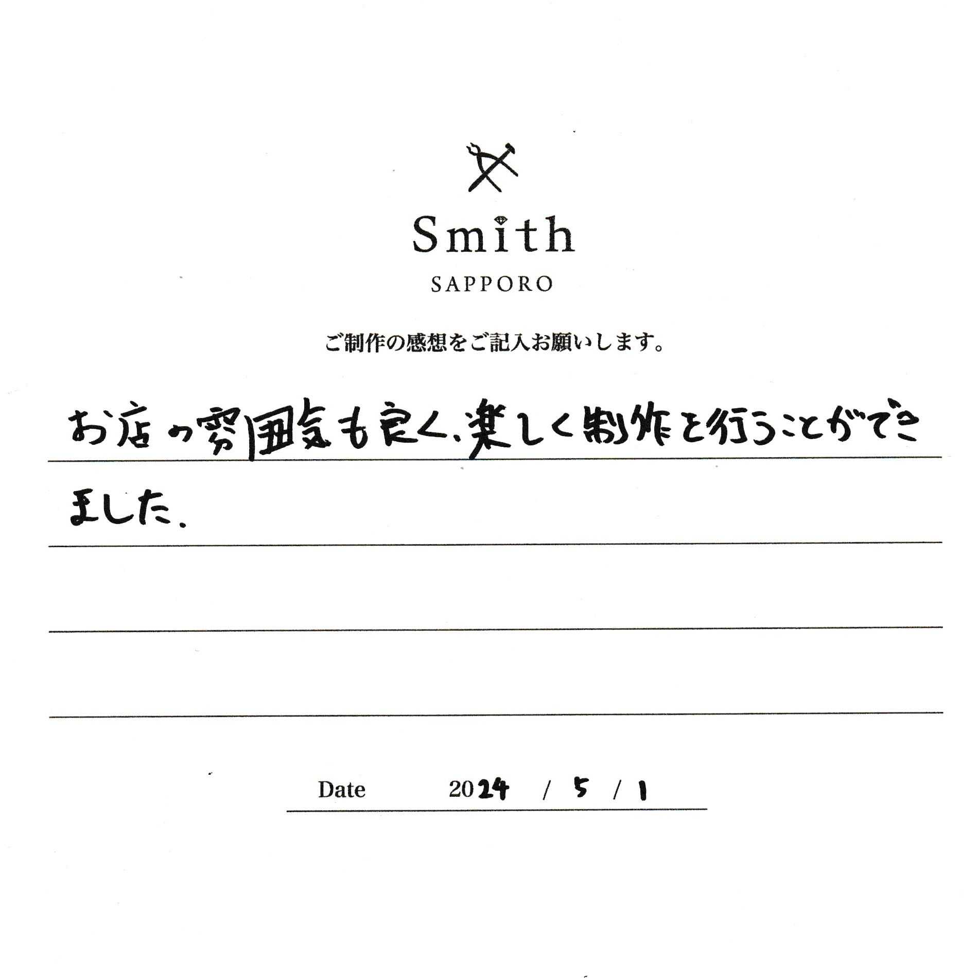 この度は、工房Smith京王プラザホテル札幌店で手作りペアリングのご制作誠にありがとうございました。