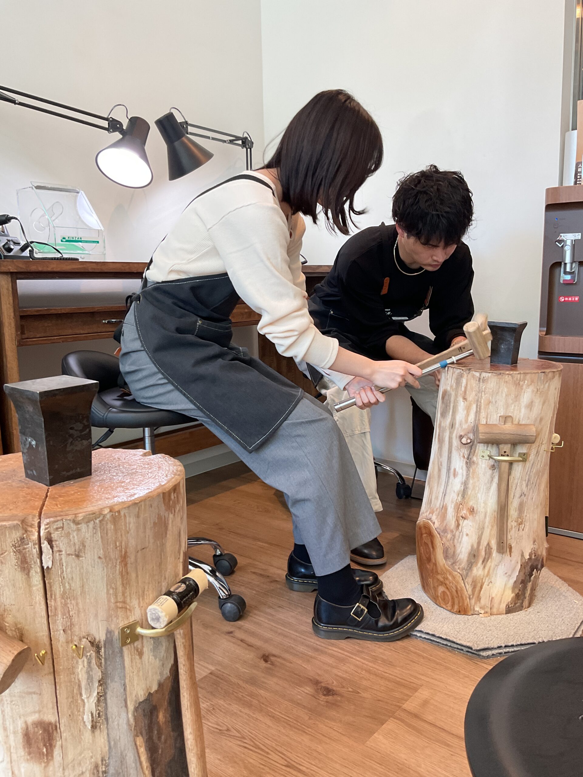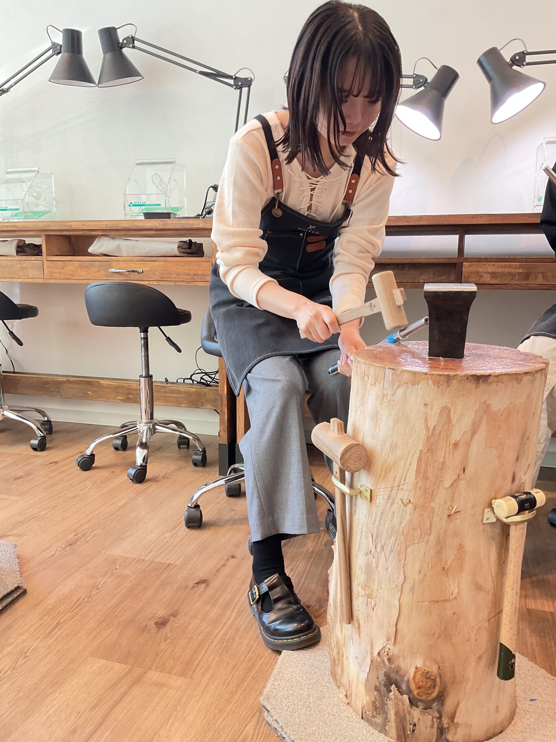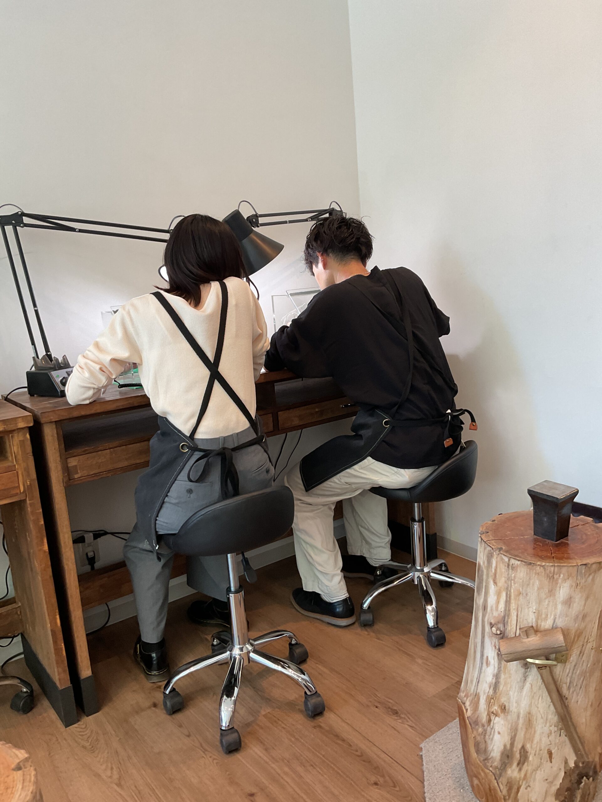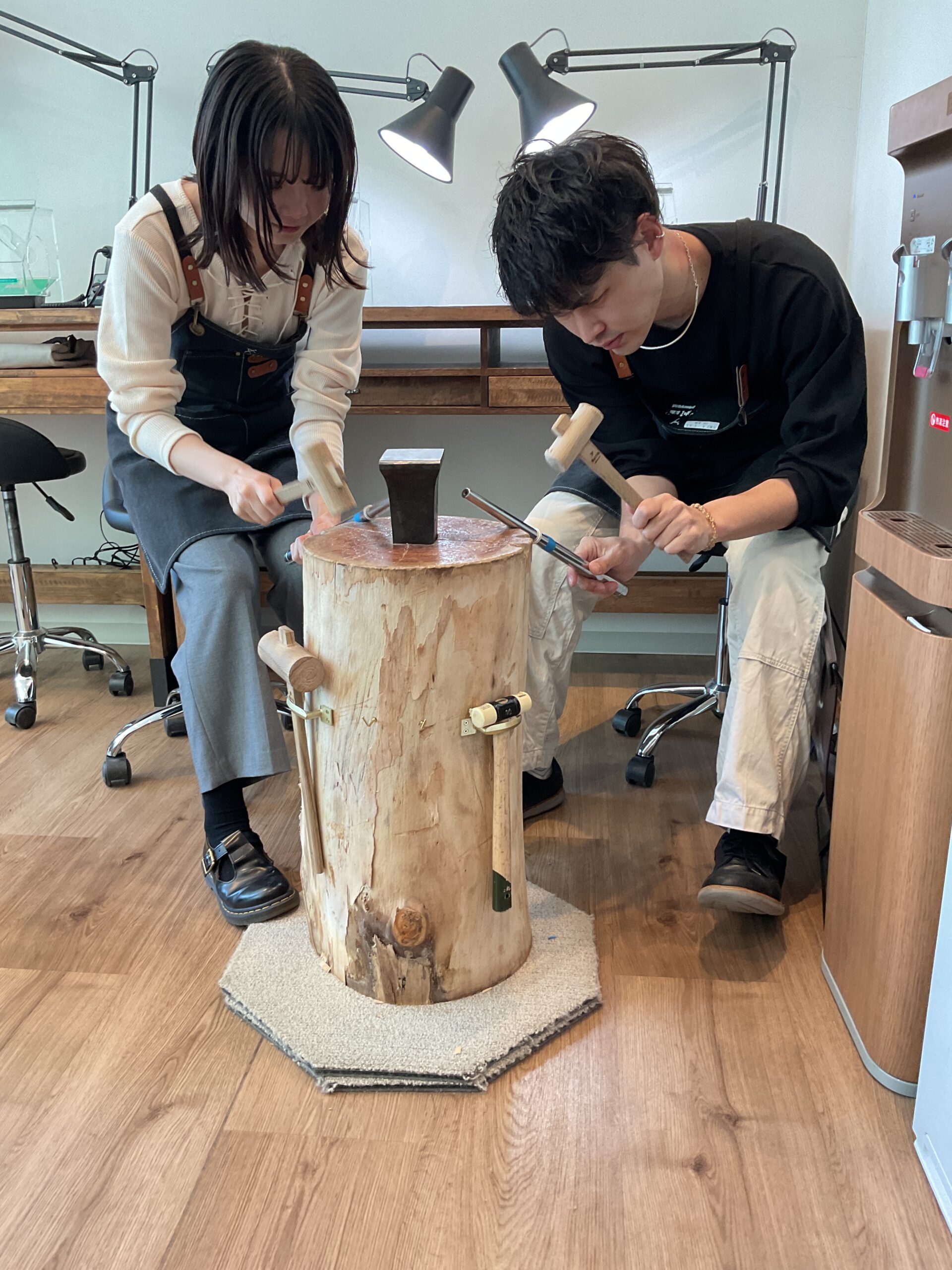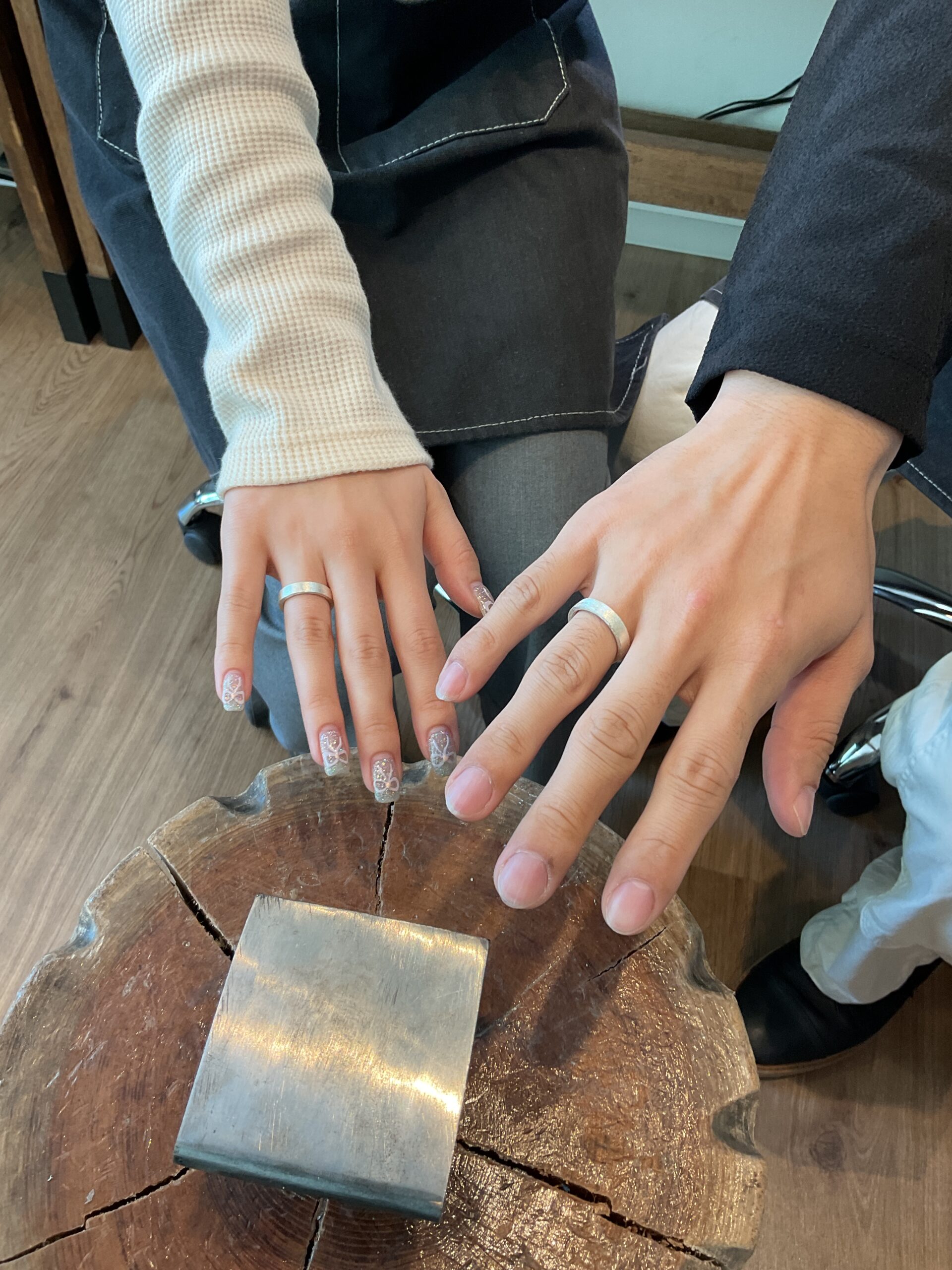 彼氏様はシルバーで彼女様はピンクゴールドで色違いのハンマー模様のリングを制作されました。