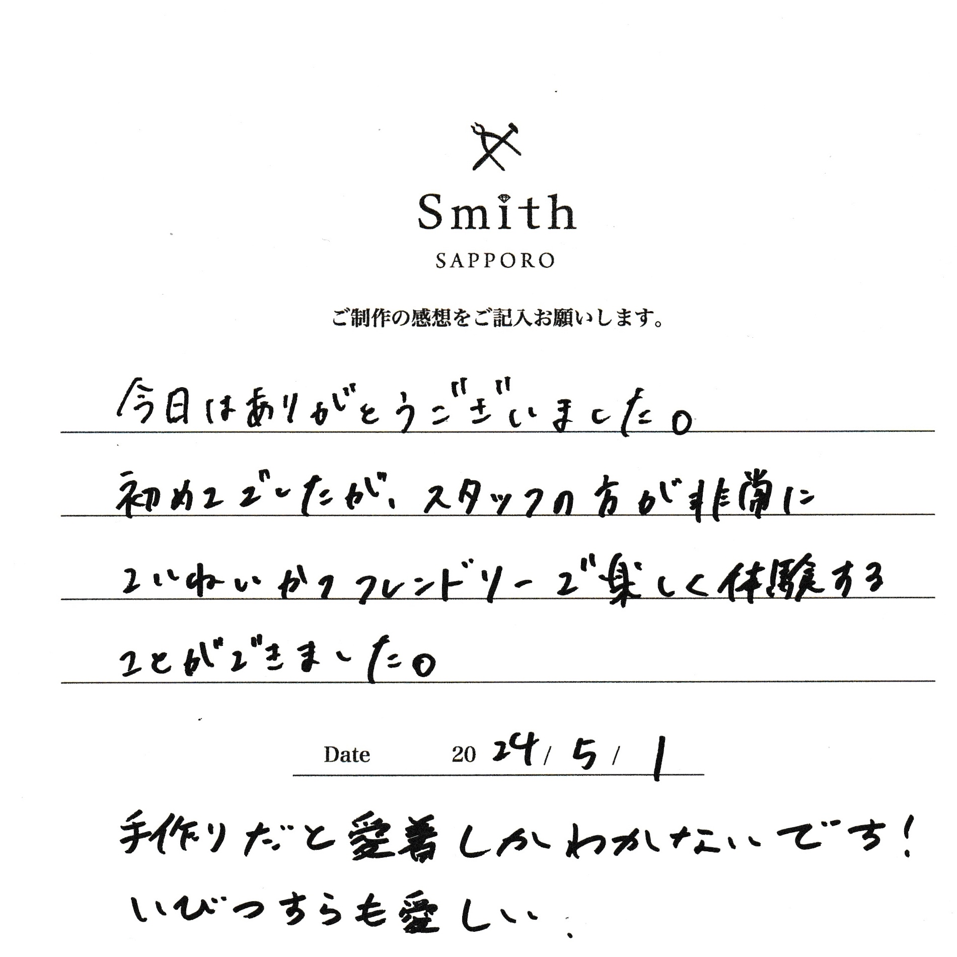 この度は、工房Smith京王プラザホテル札幌店で手作りペアリングのご制作誠にありがとうございました。