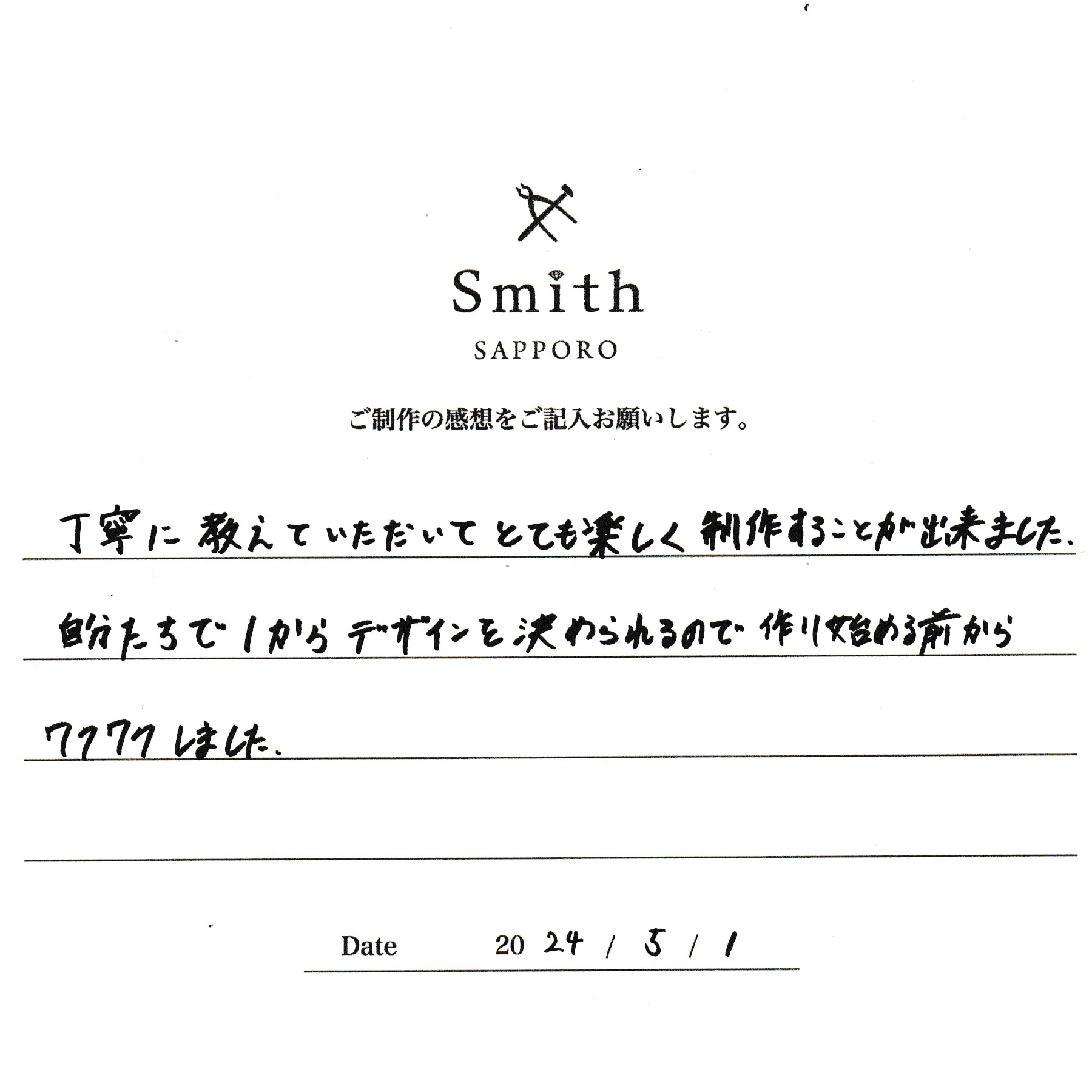 この度は、工房Smith京王プラザホテル札幌店で手作りペアリングのご制作誠にありがとうございました。