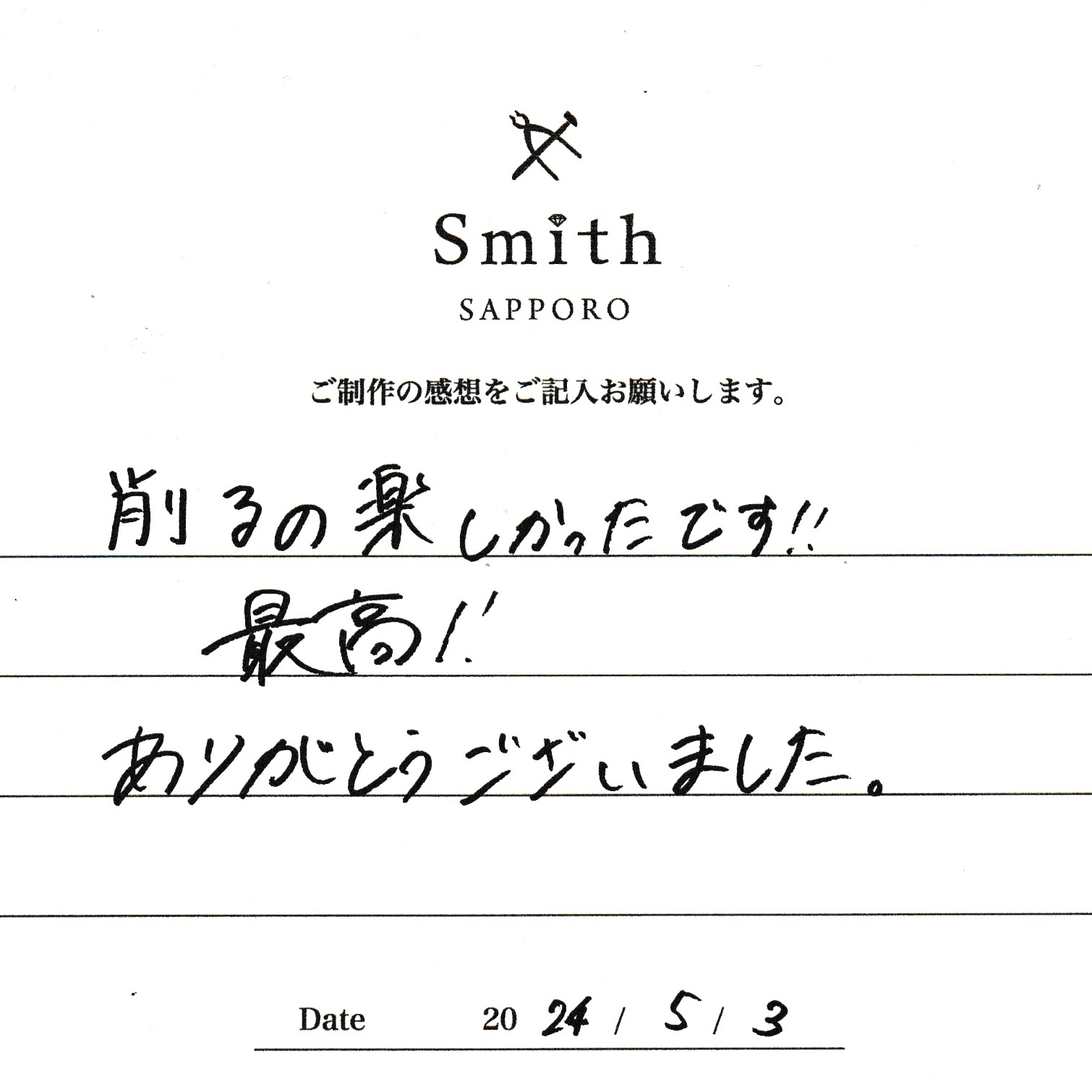 この度は、工房Smith京王プラザホテル札幌店で手作りペアリングのご制作誠にありがとうございました。