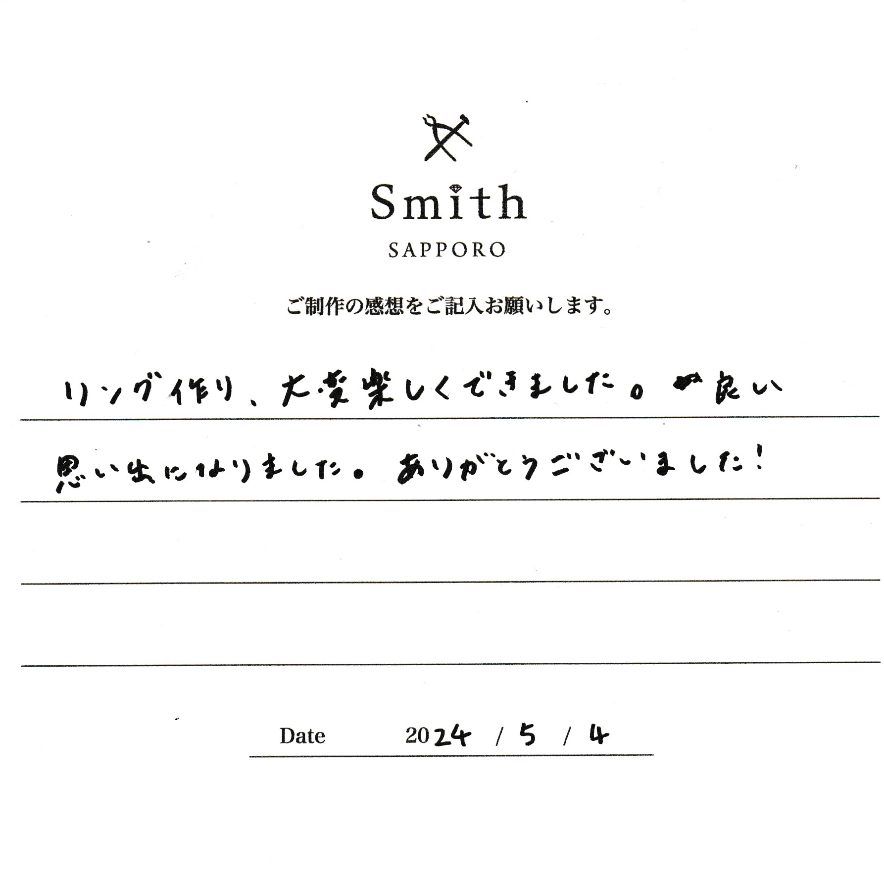 この度は、工房Smith京王プラザホテル札幌店で手作りペアリングのご制作誠にありがとうございました。