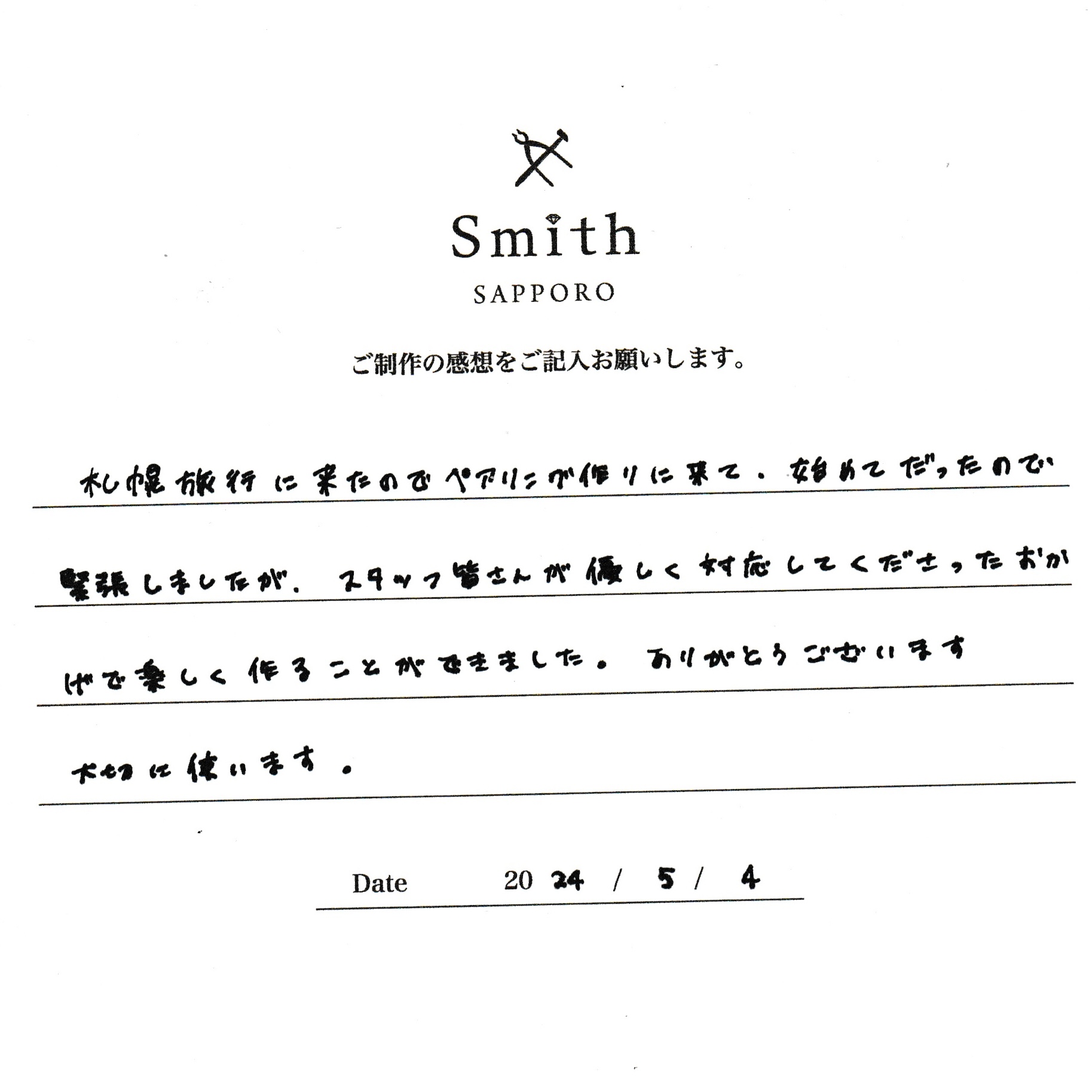 この度は、工房Smith京王プラザホテル札幌店で手作りペアリングのご制作誠にありがとうございました。