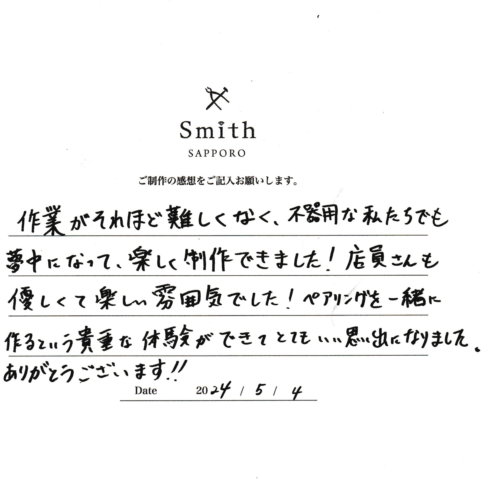 この度は、工房Smith京王プラザホテル札幌店で手作りペアリングのご制作誠にありがとうございました。