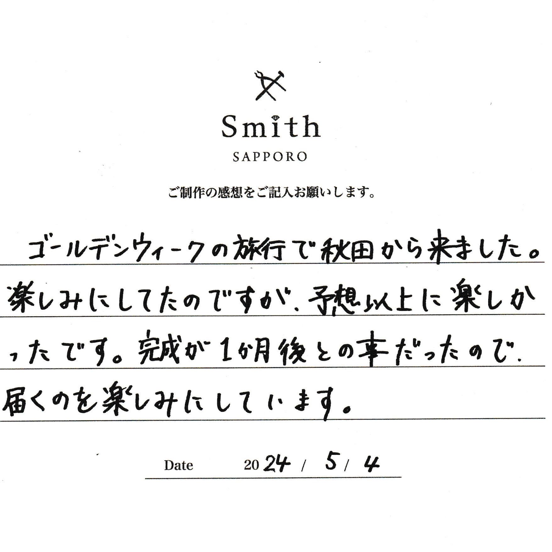 この度は、工房Smith京王プラザホテル札幌店で手作りペアリングのご制作誠にありがとうございました。
