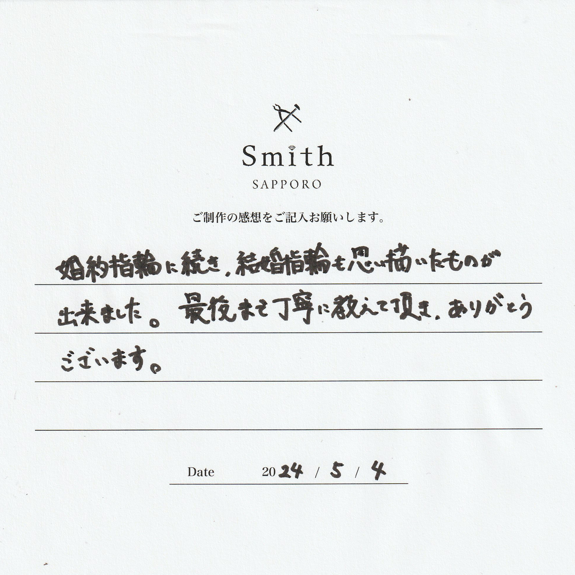 この度は婚約指輪の続きまして結婚指輪をご制作いただきまして、誠にありがとうございます。