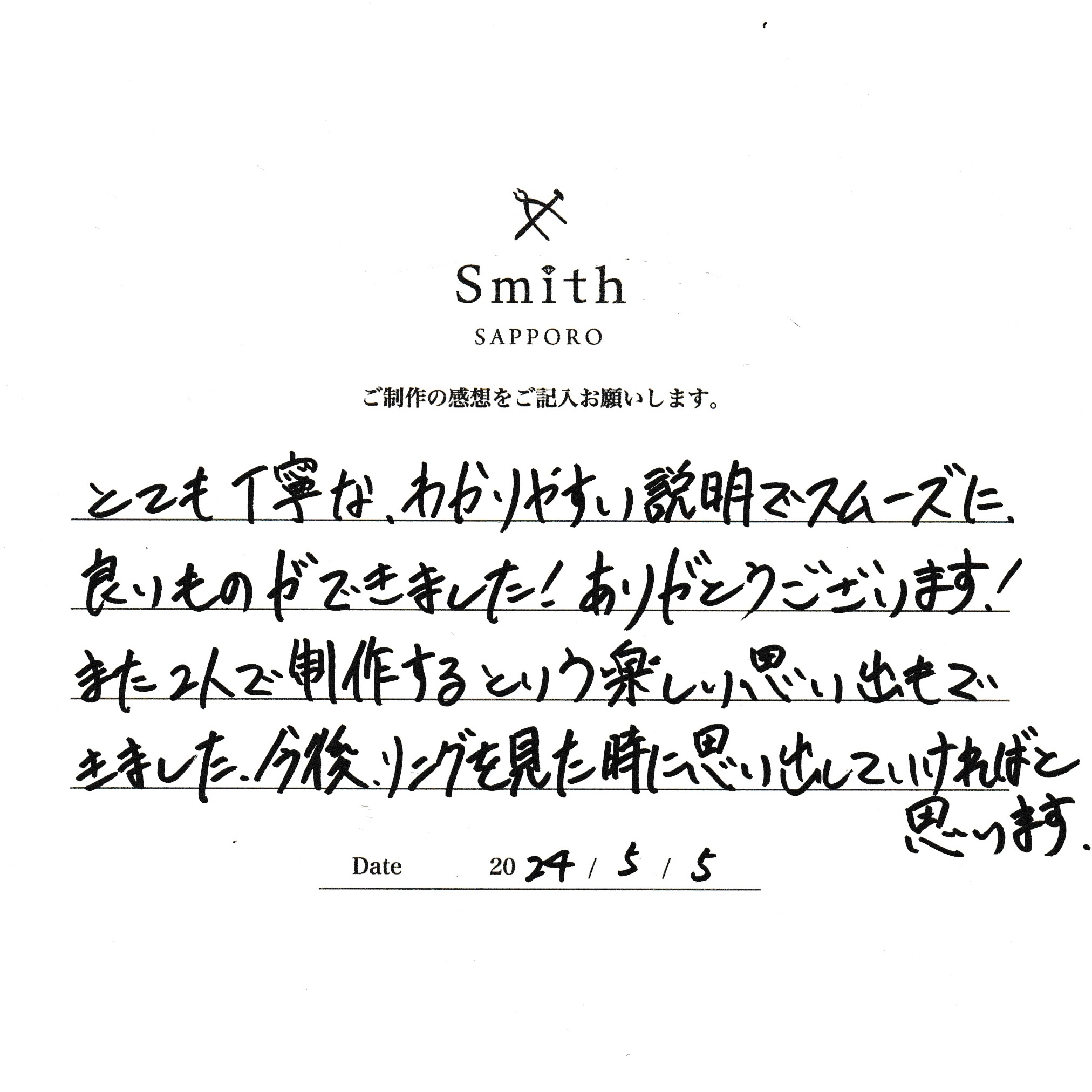 この度は、工房Smith京王プラザホテル札幌店で手作りペアリングのご制作誠にありがとうございました。