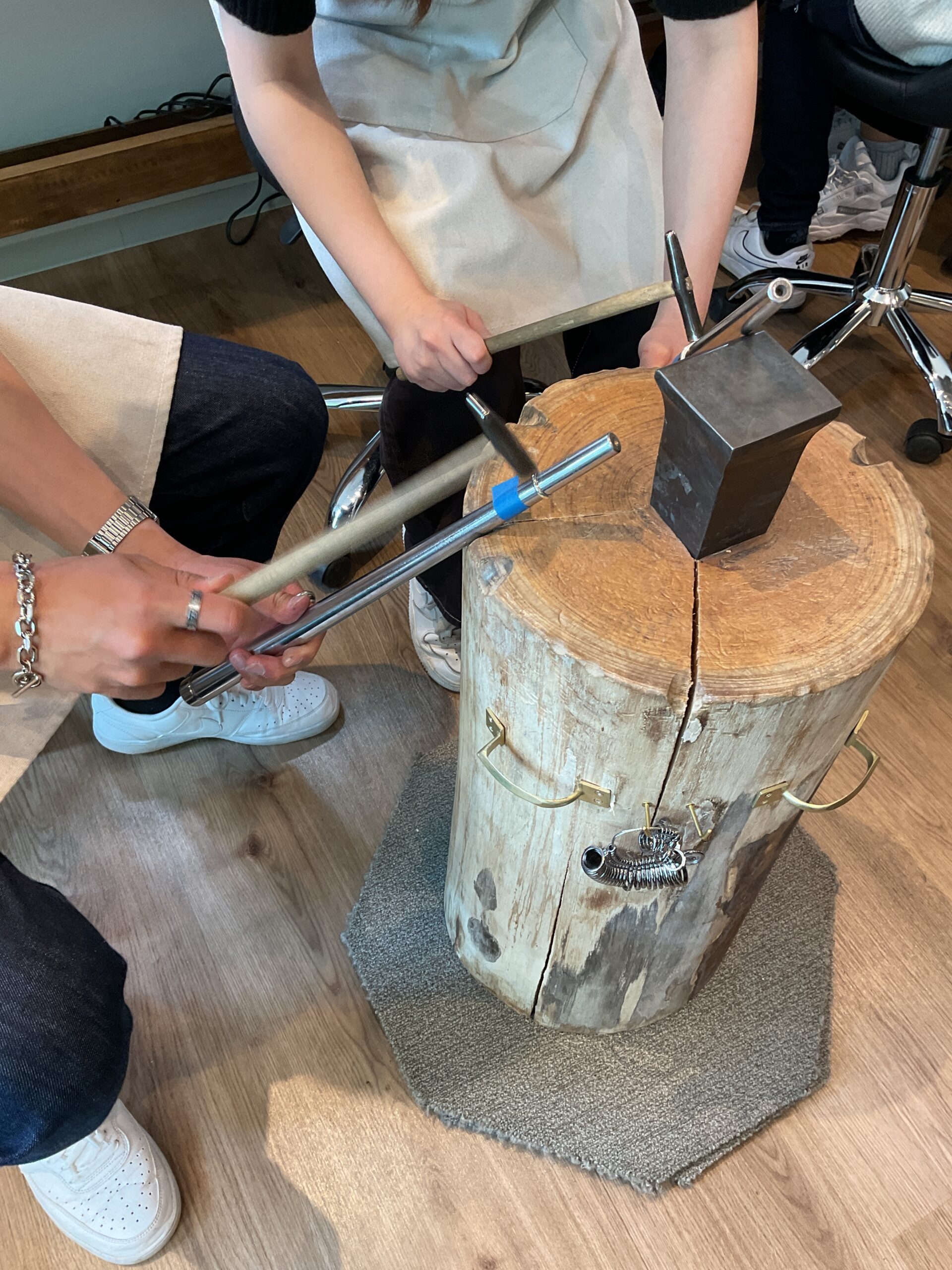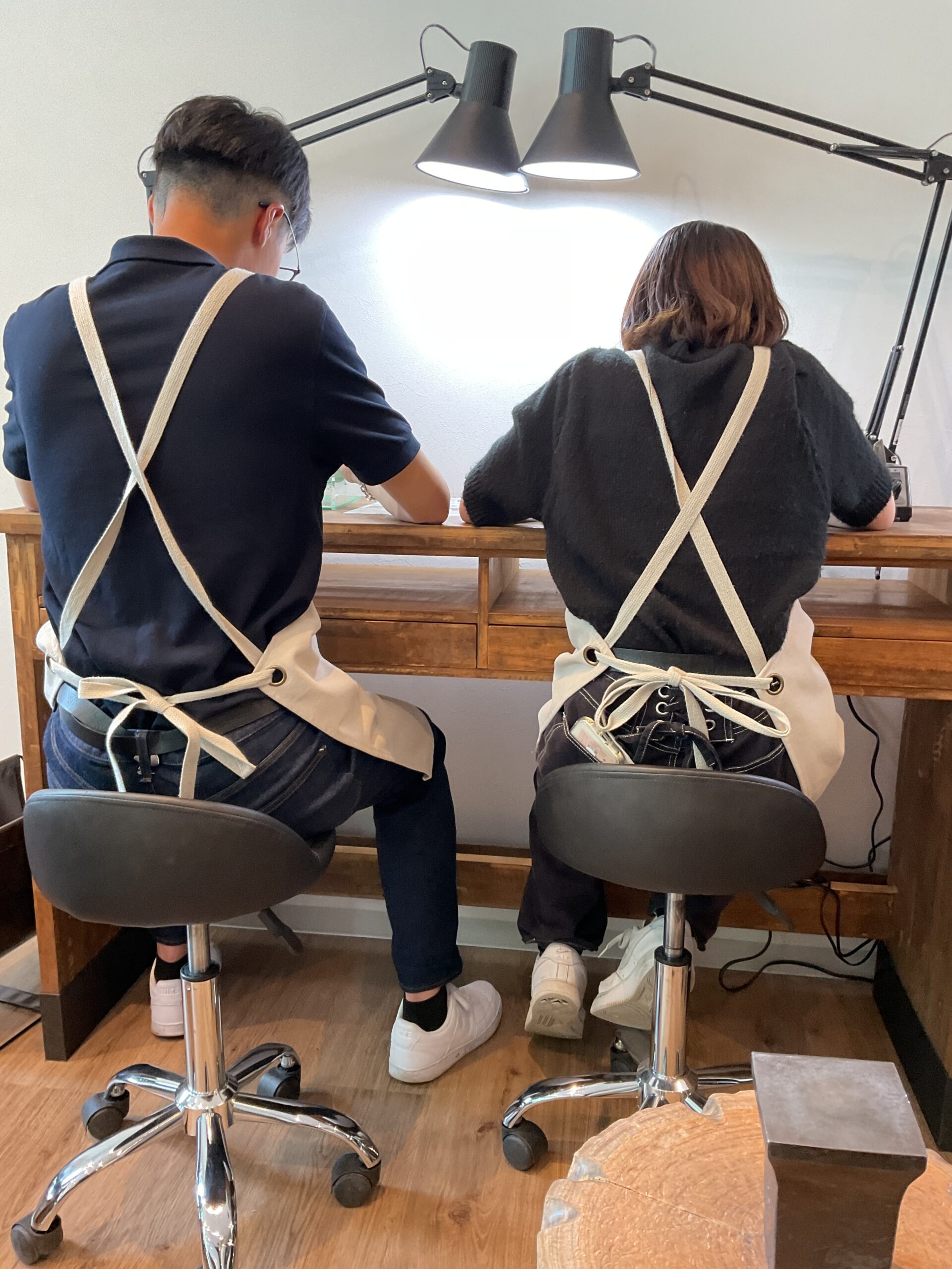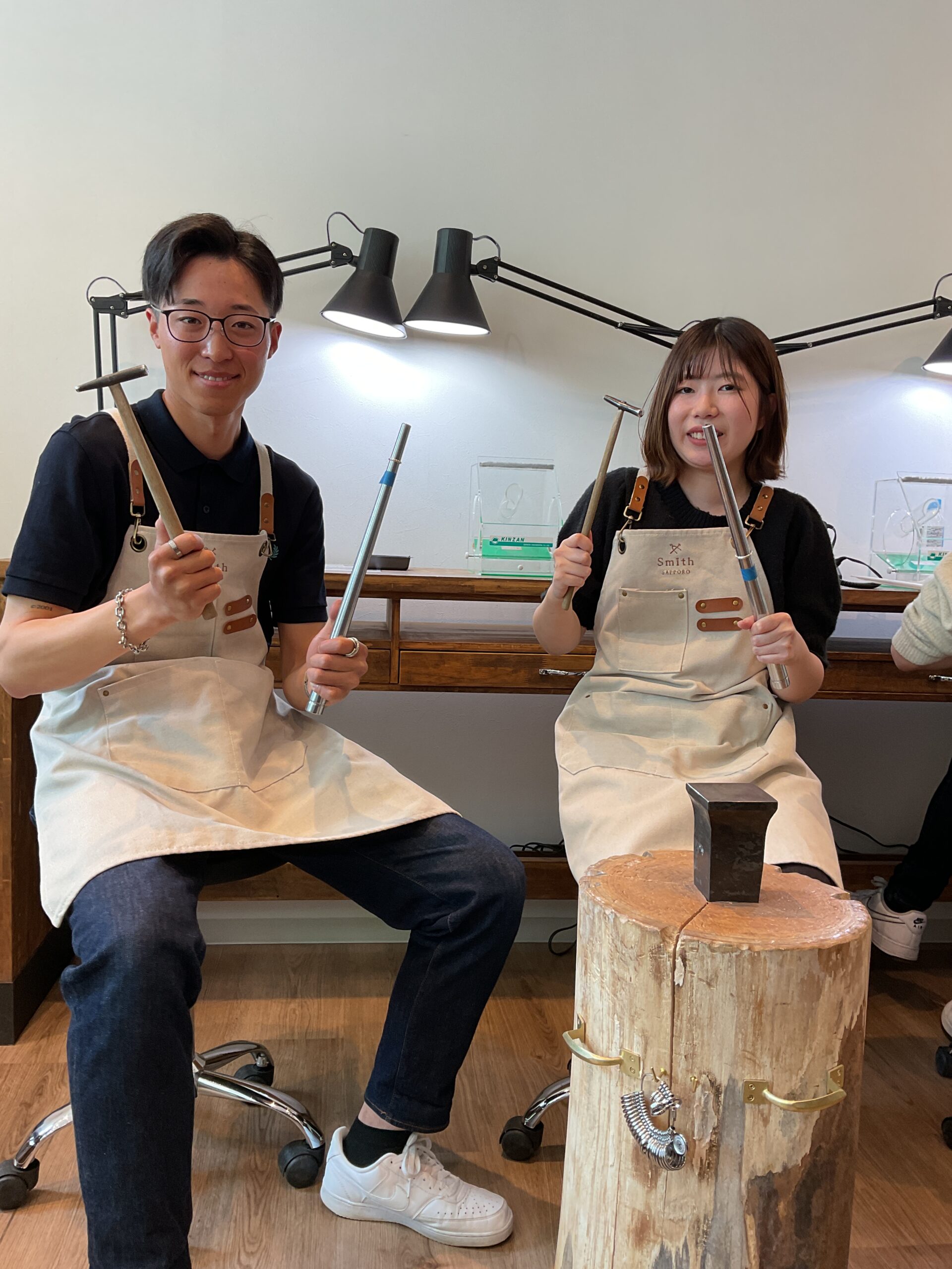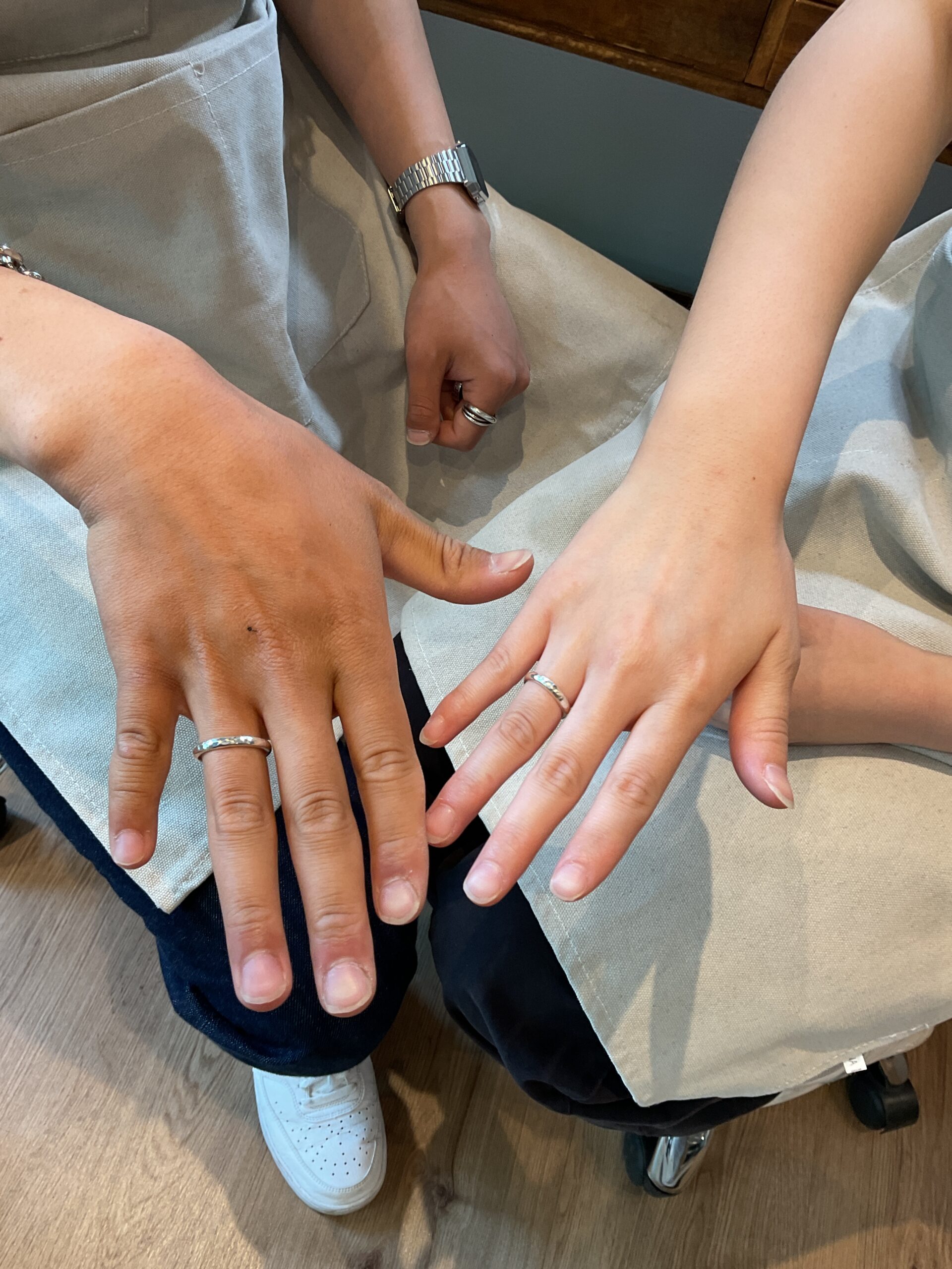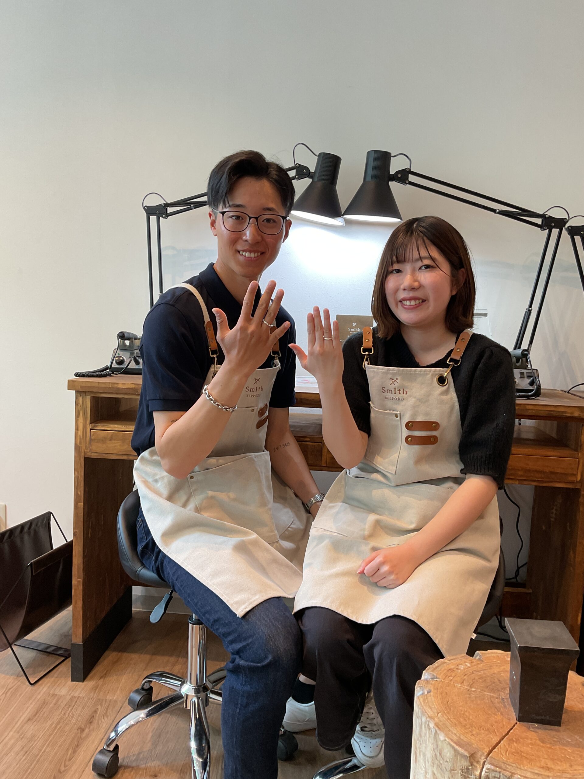 お二人がピカピカに磨いたリングはハンマー模様が入り、キラキラと光を反射する素敵なペアリングになりましたね。