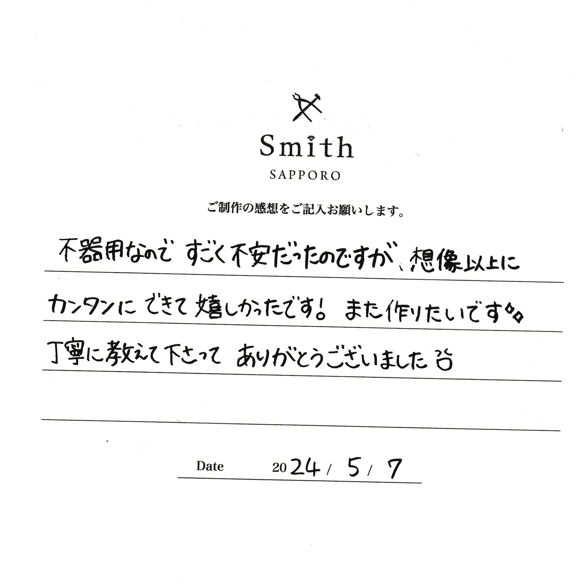 この度は、工房Smith京王プラザホテル札幌店で手作りペアリングのご制作誠にありがとうございました。