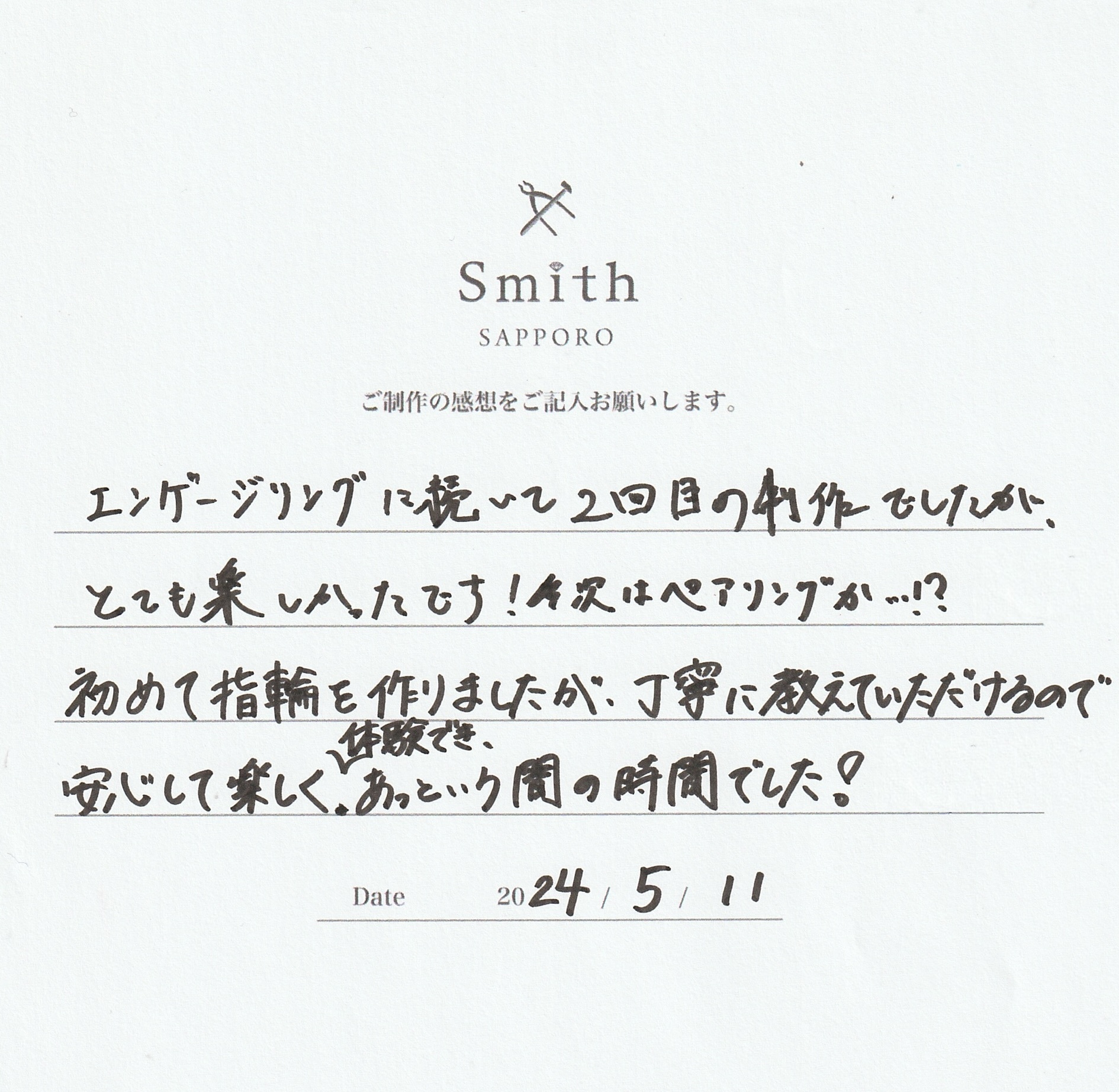 エンゲージリングに続いて2回目の制作でしたがとても楽しかったです!