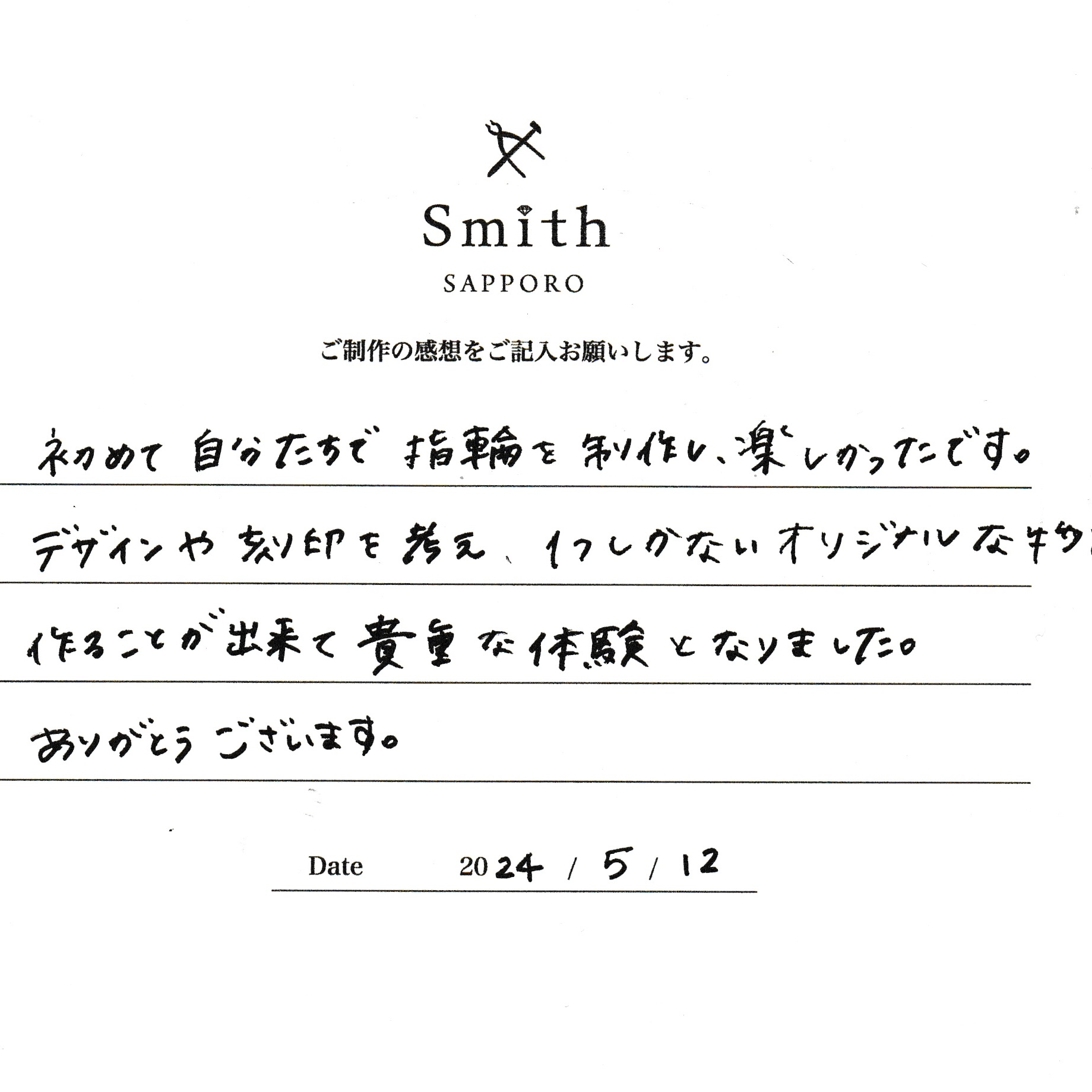 この度は、工房Smith京王プラザホテル札幌店で手作りペアリングのご制作誠にありがとうございました。