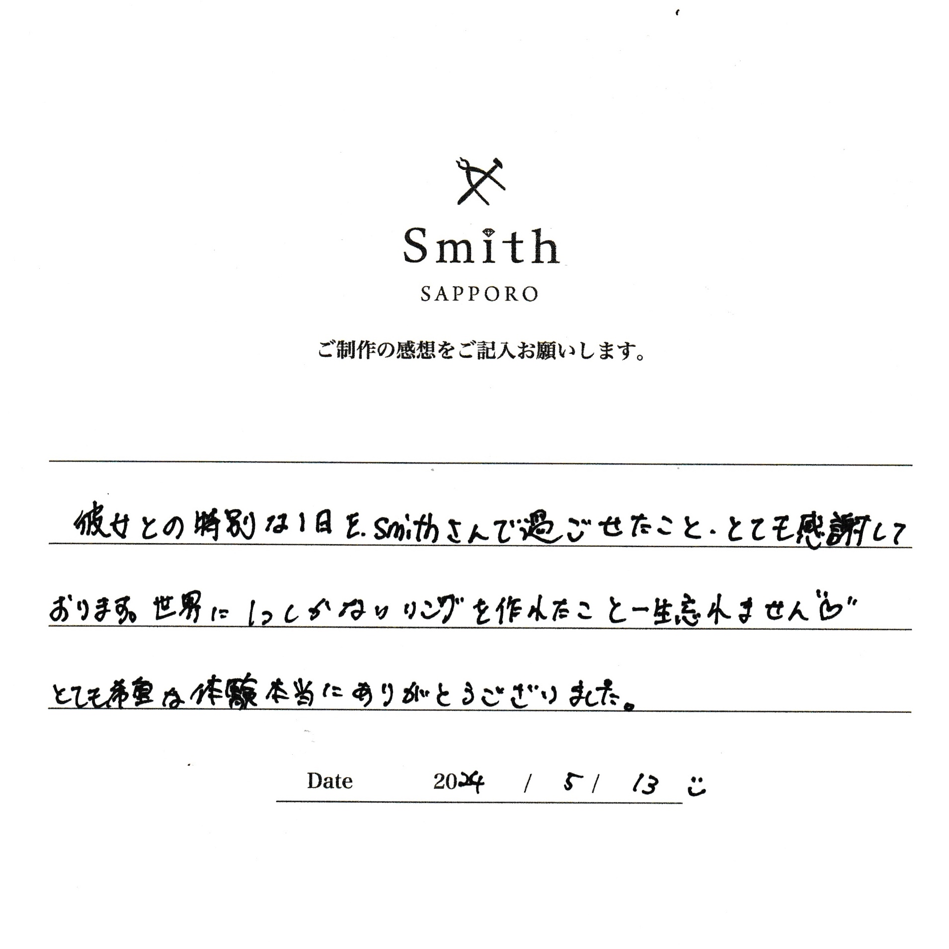 この度は、工房Smith京王プラザホテル札幌店で手作りペアリングのご制作誠にありがとうございました。