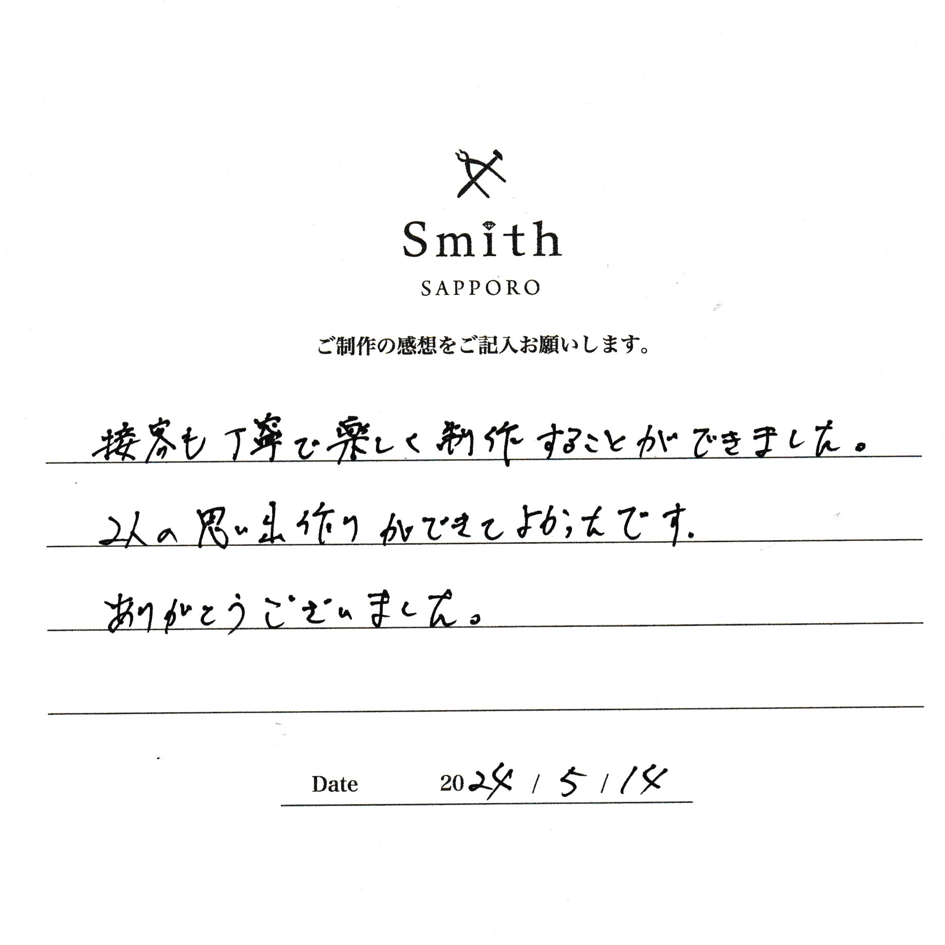 この度は、工房Smith京王プラザホテル札幌店で手作りペアリングのご制作誠にありがとうございました。