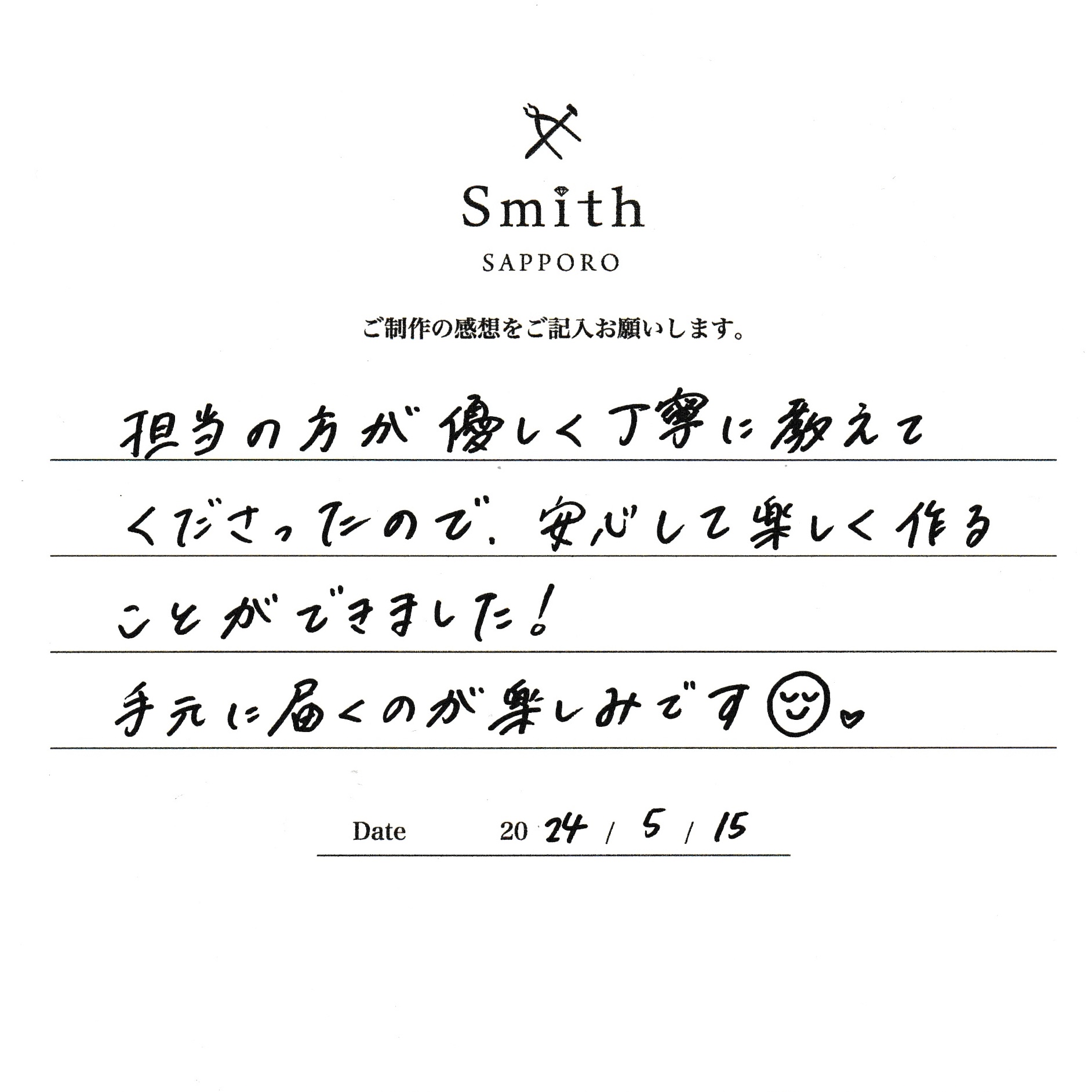 この度は、工房Smith京王プラザホテル札幌店で手作りペアリングのご制作誠にありがとうございました。