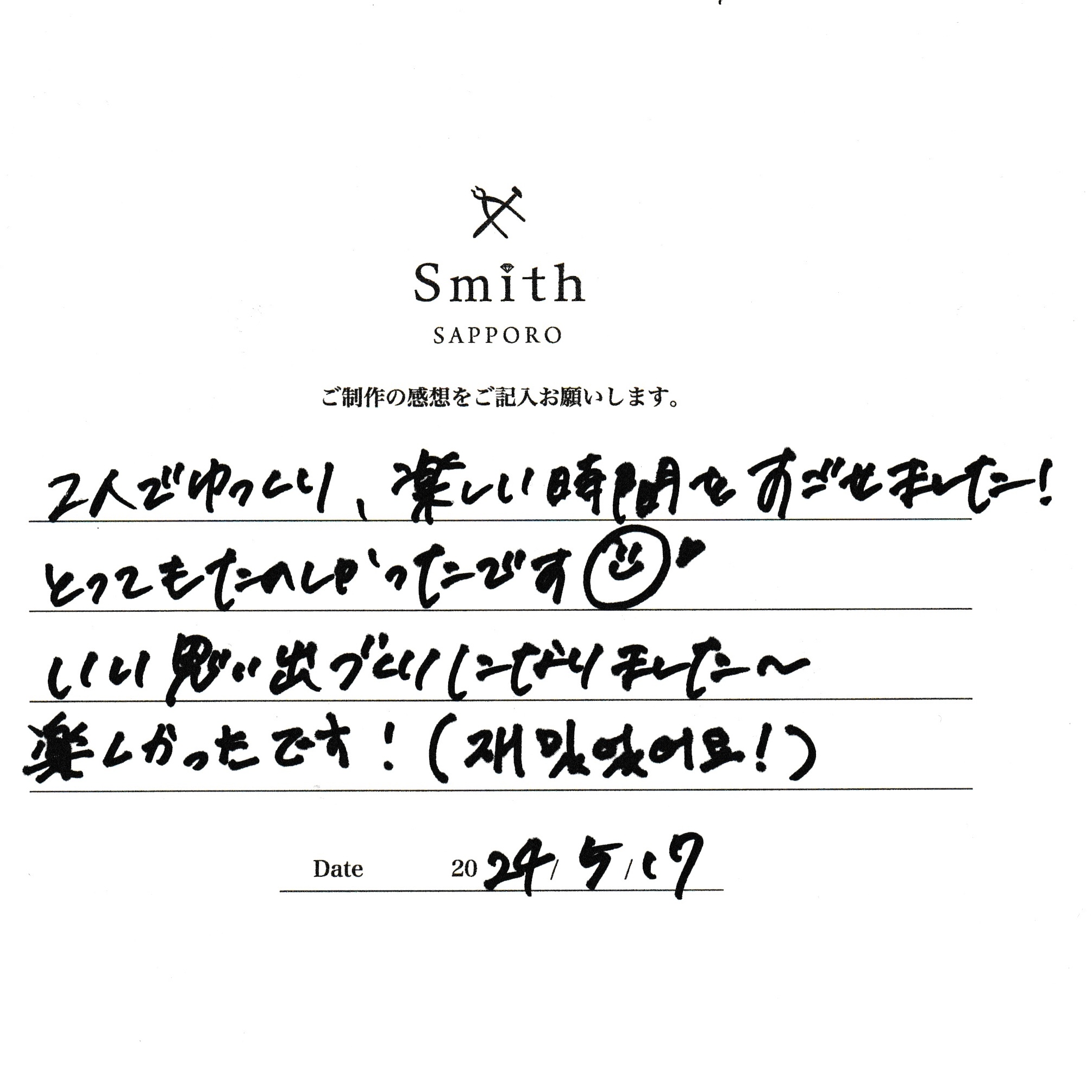 この度は、工房Smith京王プラザホテル札幌店で手作りペアリングのご制作誠にありがとうございました。