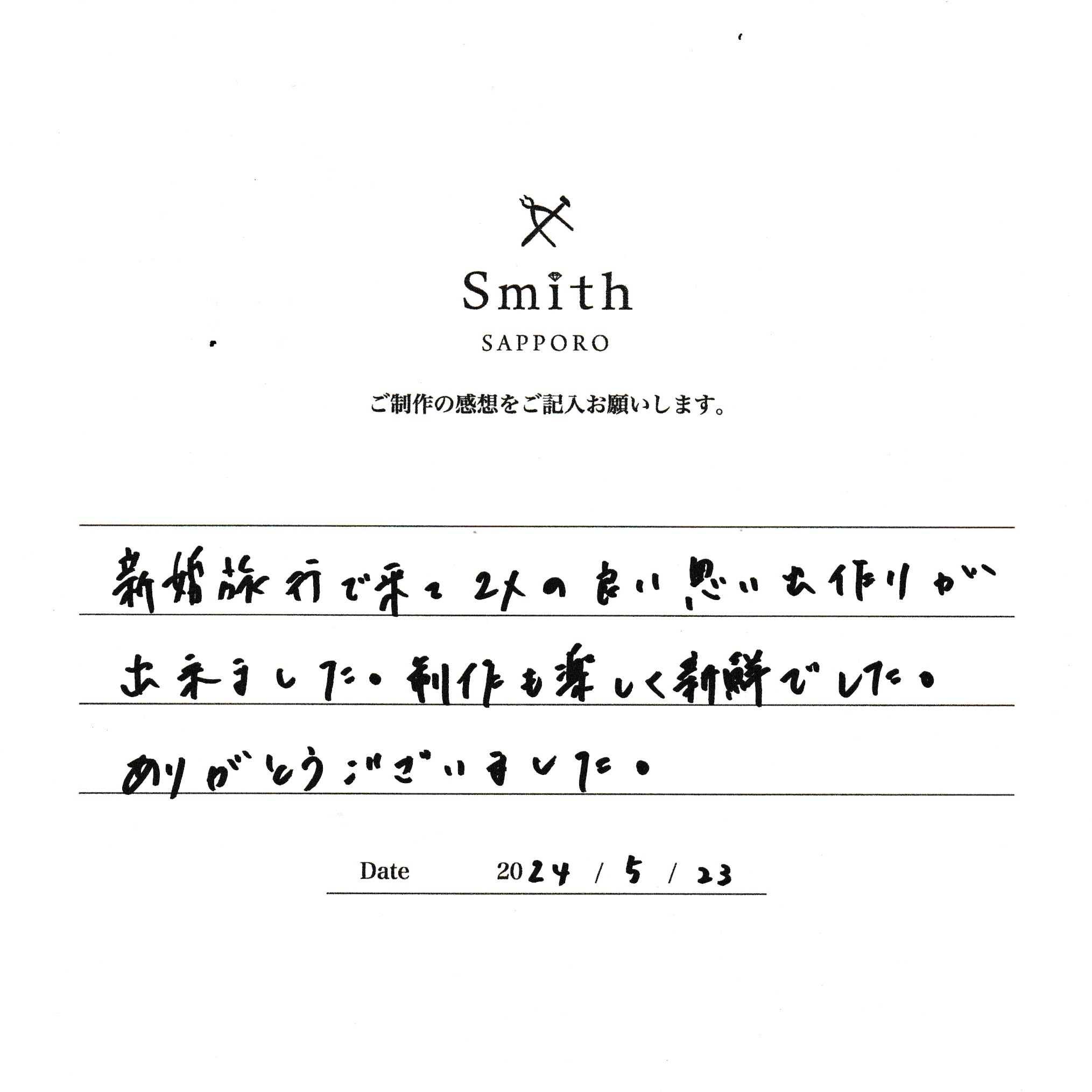 この度は、工房Smith京王プラザホテル札幌店で手作りペアリングのご制作 誠にありがとうございました。