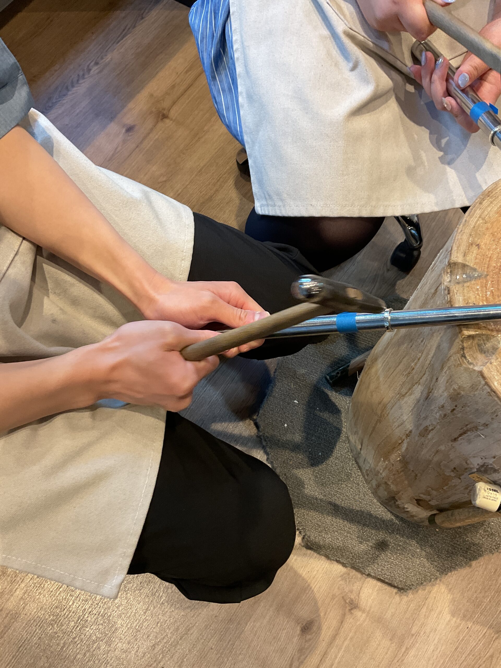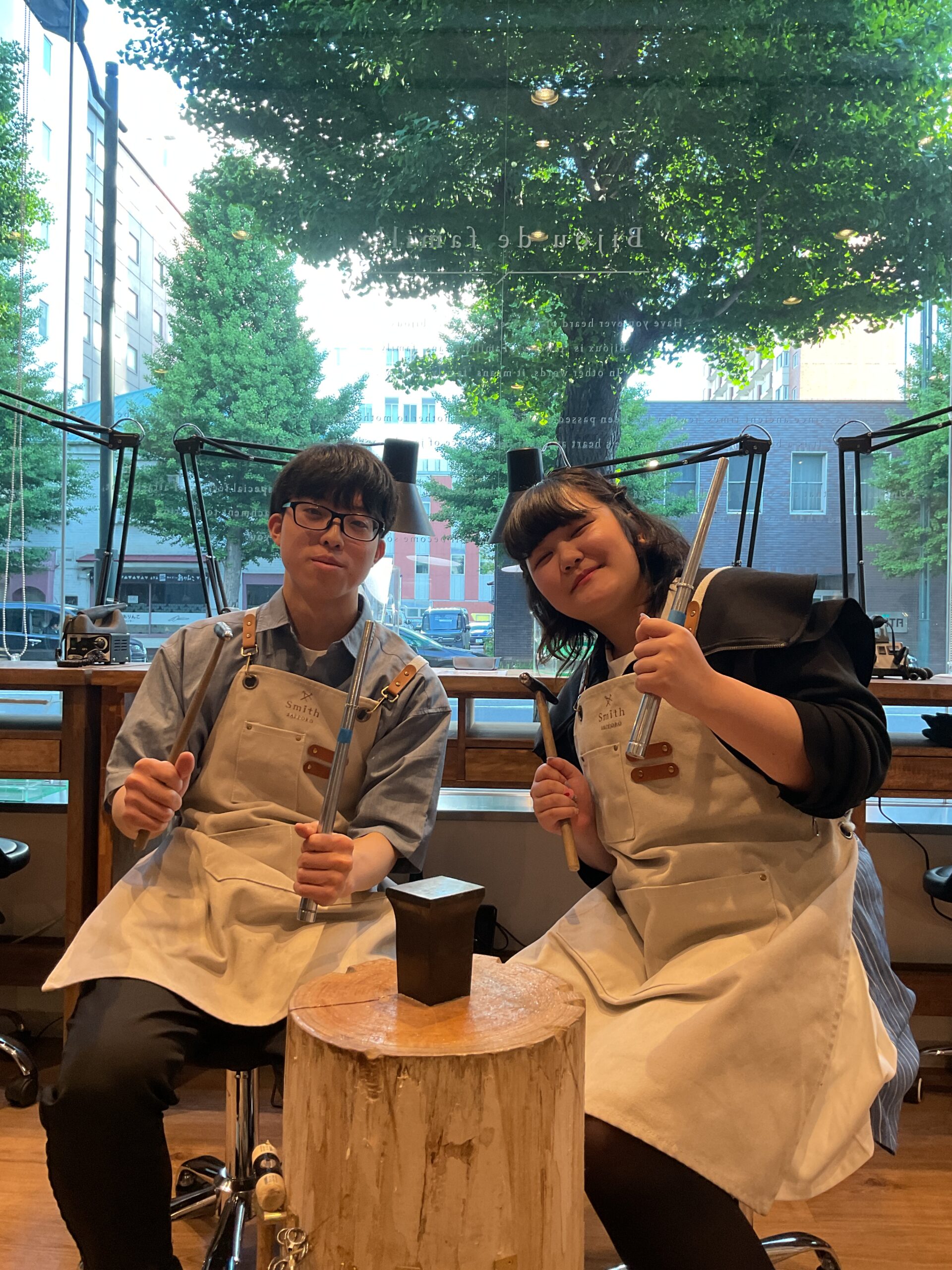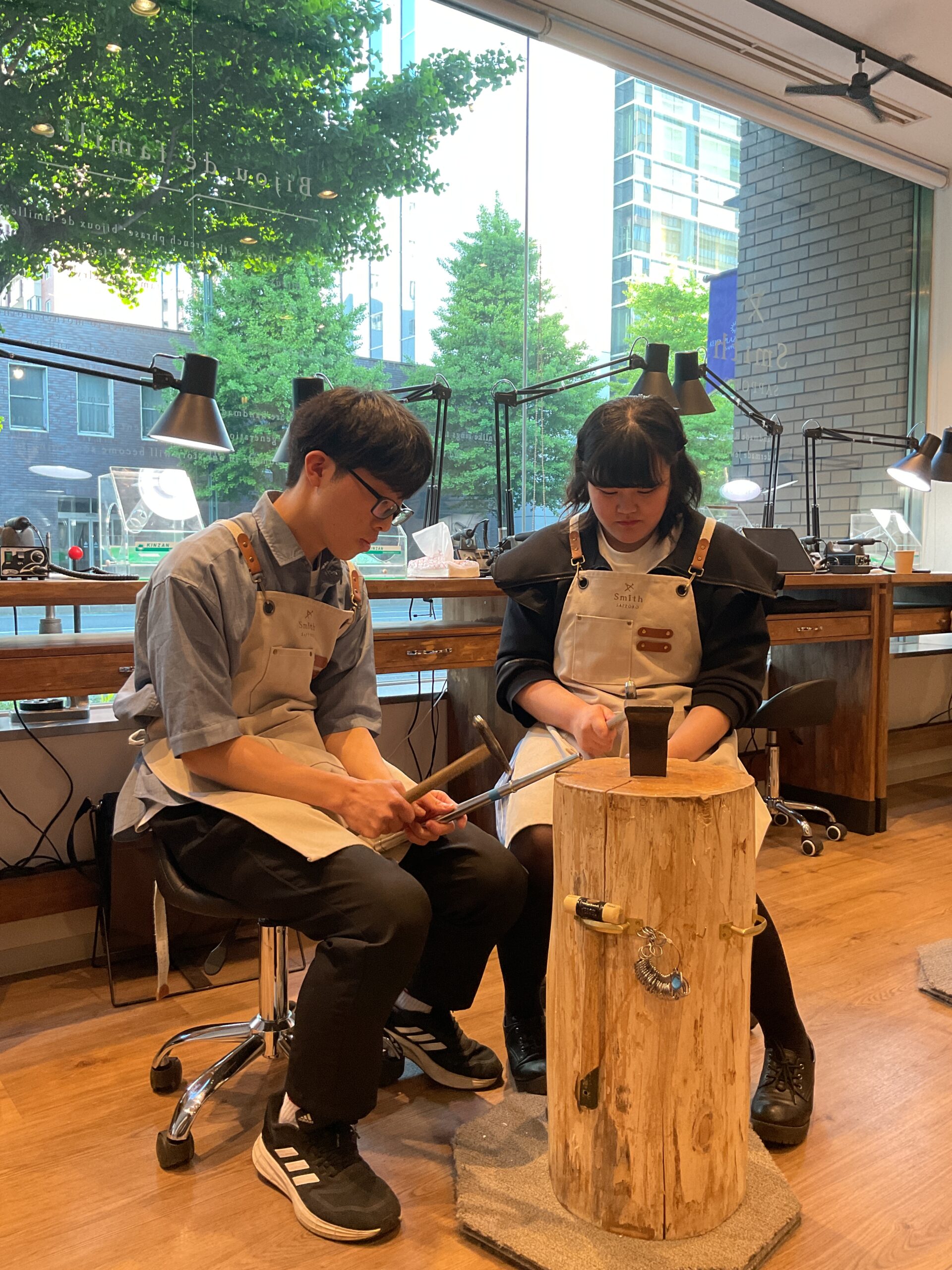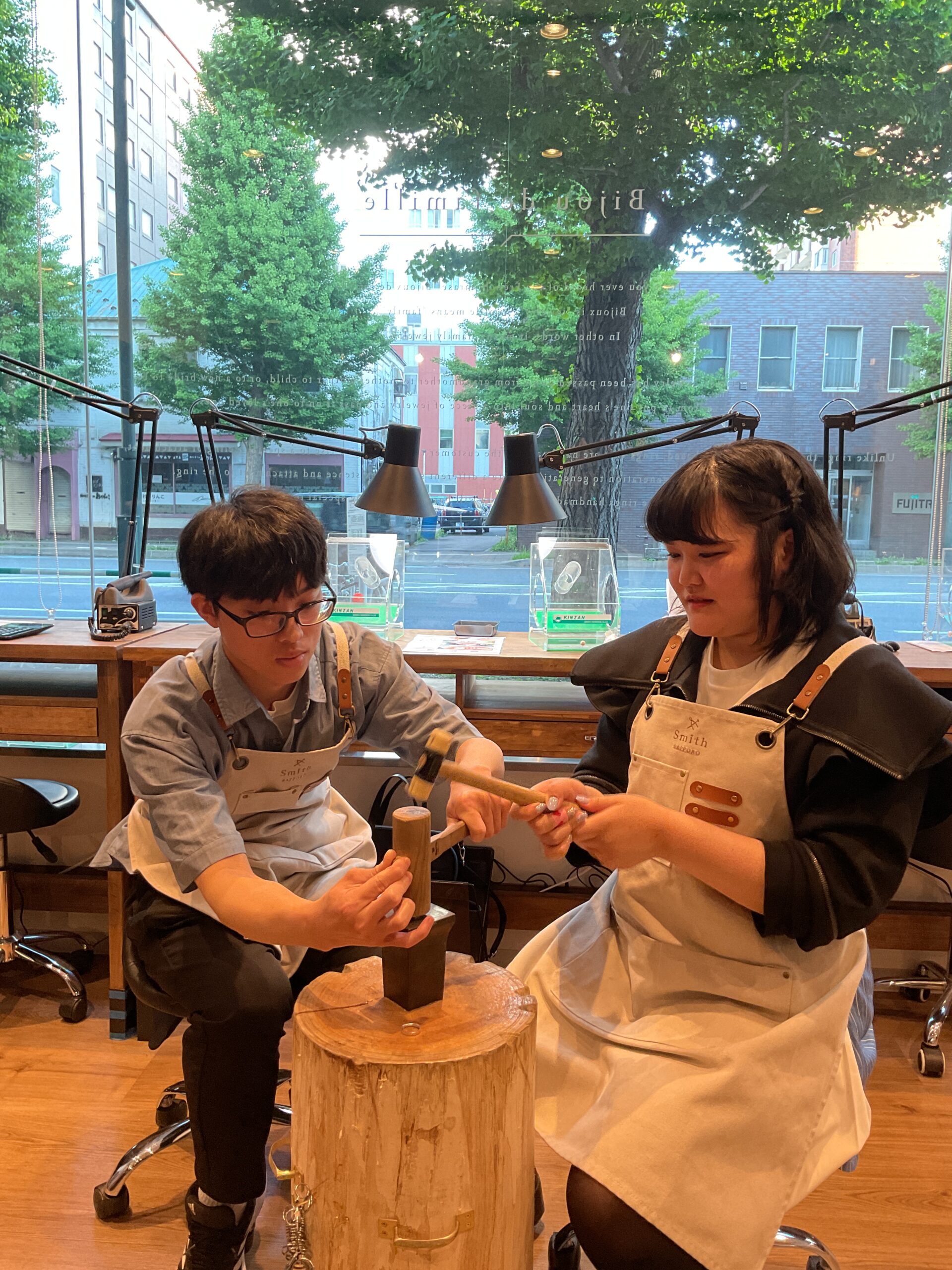 ピカピカに磨いたリングにハンマーで模様をつけ、とても可愛らしいペアリングができましたね。