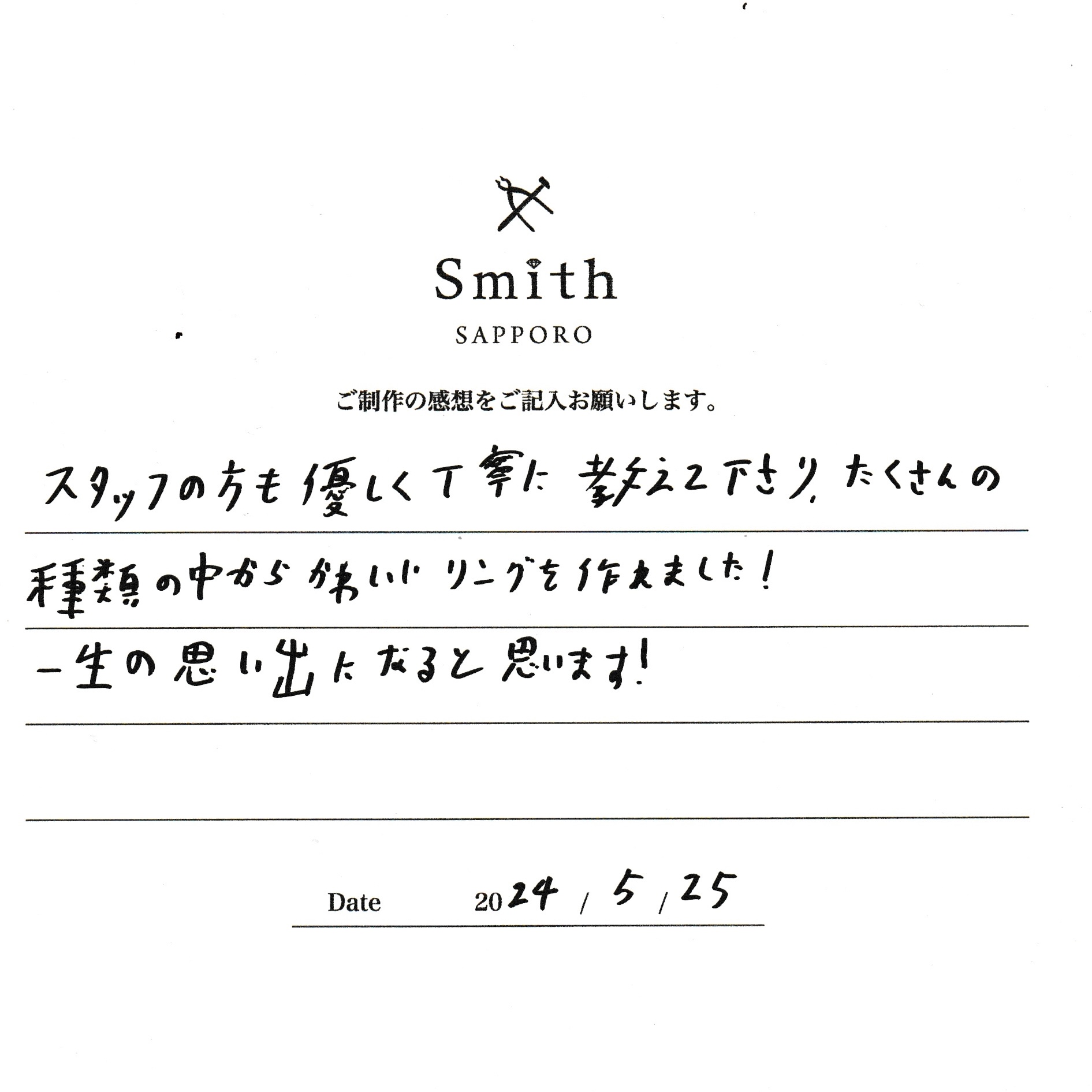 この度は、工房Smith京王プラザホテル札幌店で手作りペアリングのご制作誠にありがとうございました。