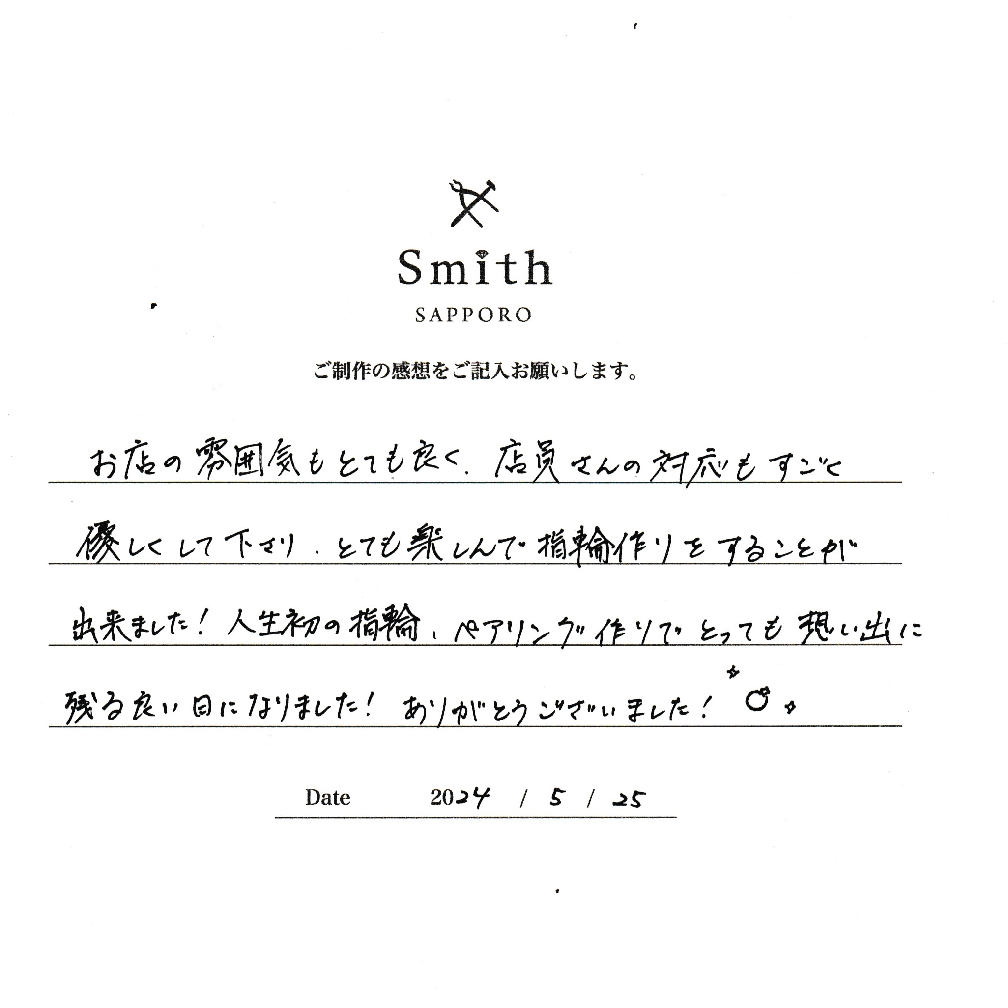 この度は、工房Smith京王プラザホテル札幌店で手作りペアリングのご制作誠にありがとうございました。