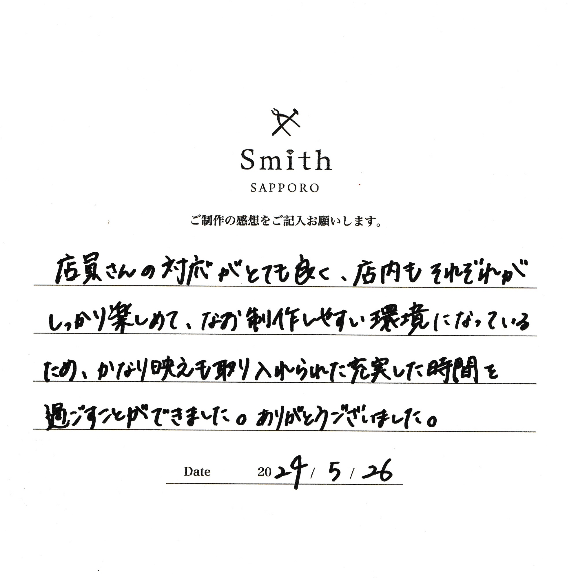 この度は、工房Smith京王プラザホテル札幌店で手作りペアリングのご制作誠にありがとうございました。