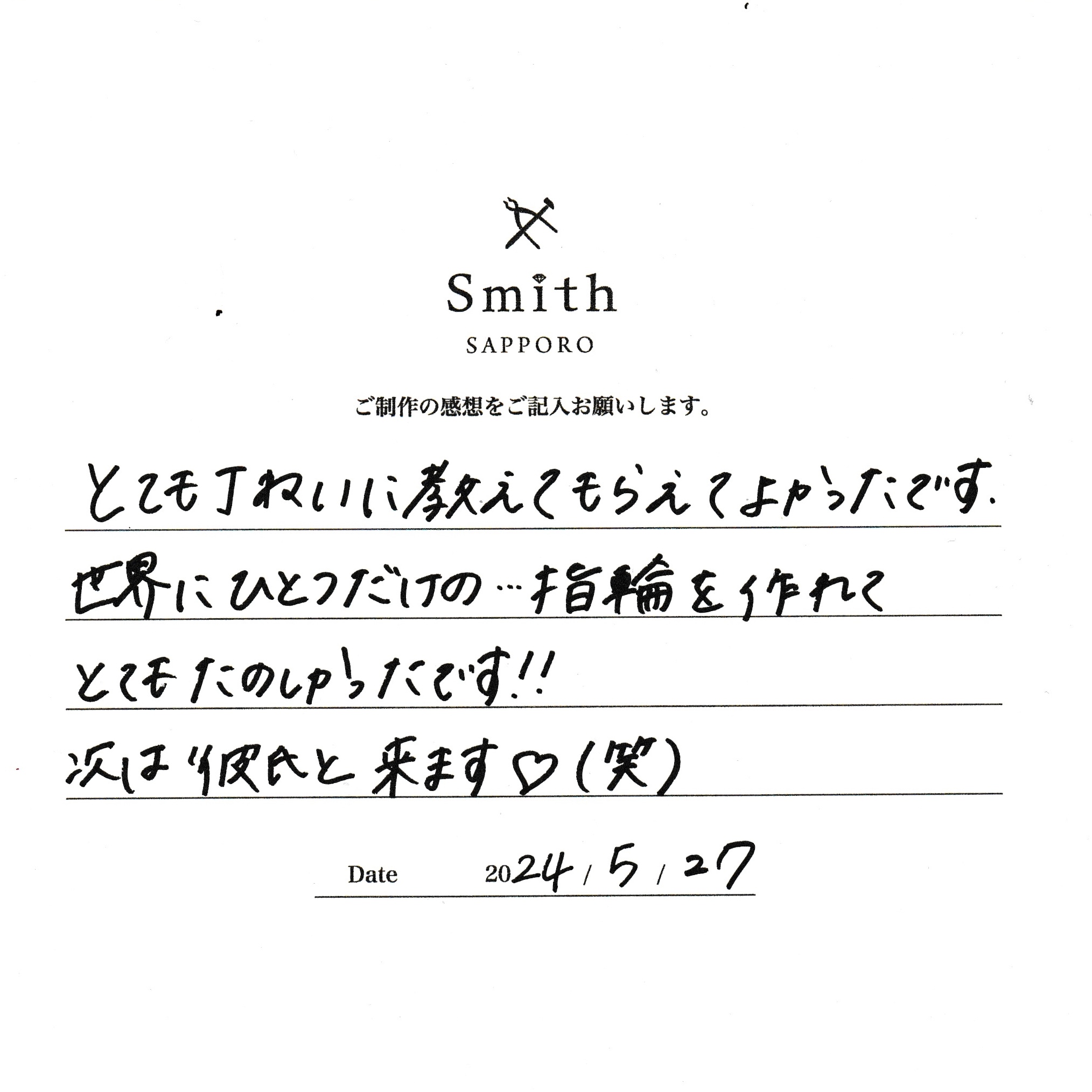 この度は、工房Smith京王プラザホテル札幌店で手作りペアリングのご制作誠にありがとうございました。
