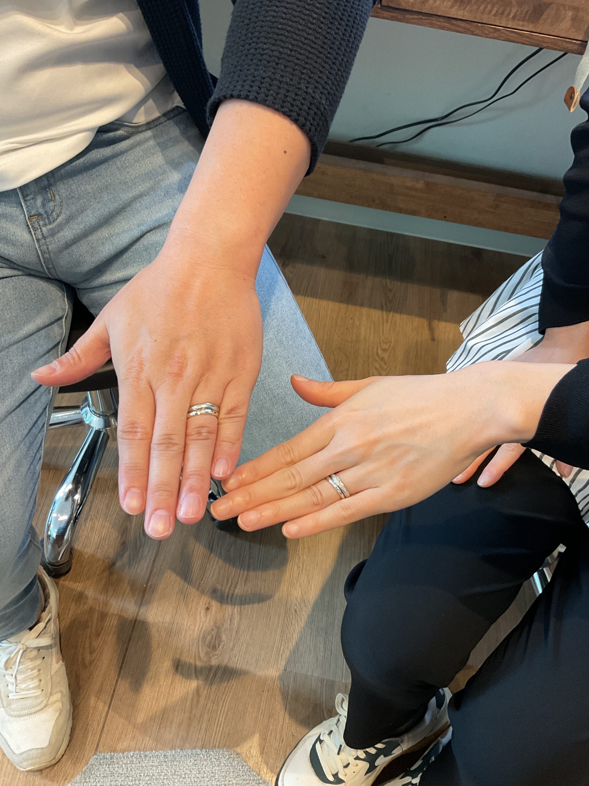 シャンパンゴールドでハンマー模様のリングをお揃いで作られました。
