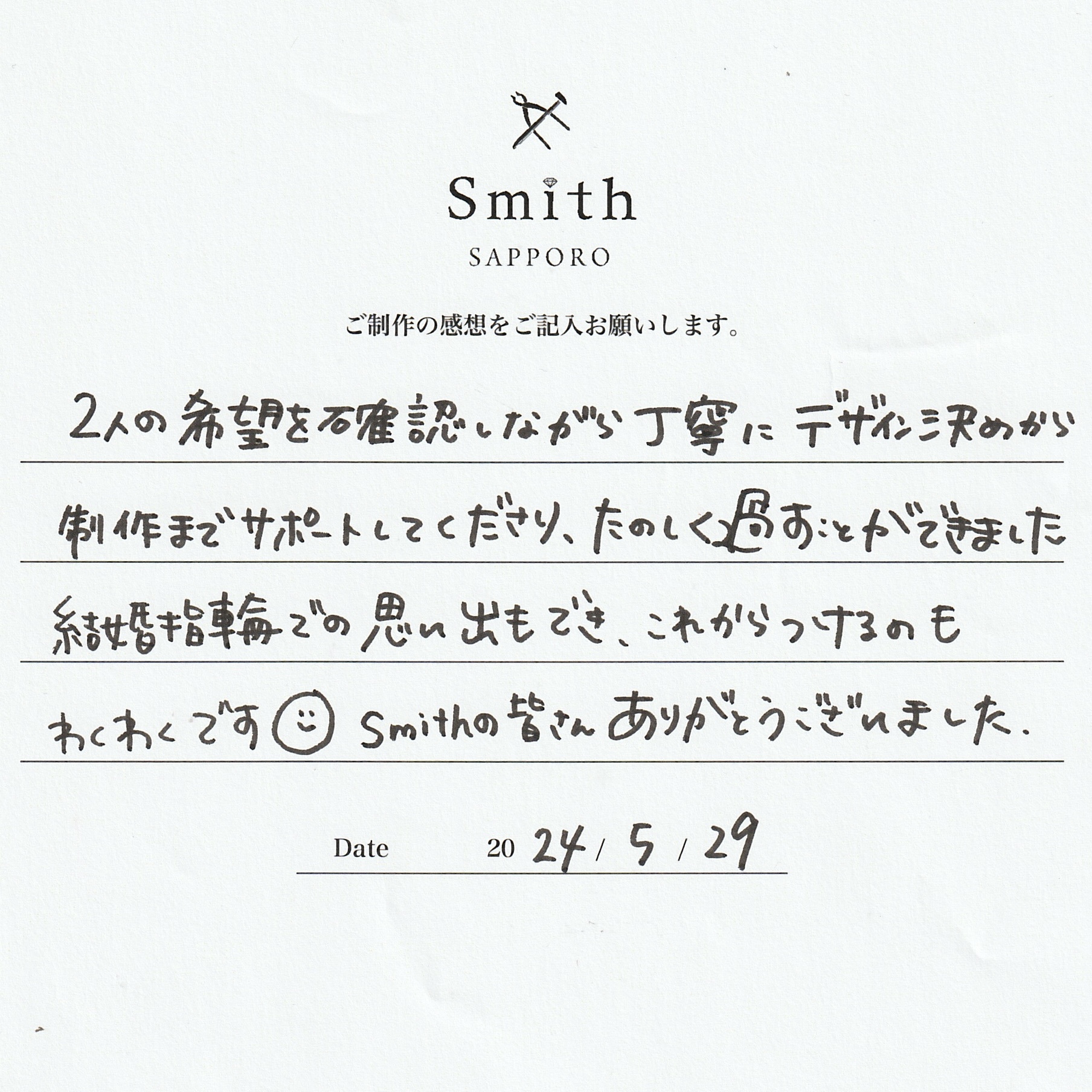 この度は手作り指輪のご制作にご来店いただきまして、誠にありがとうございます。