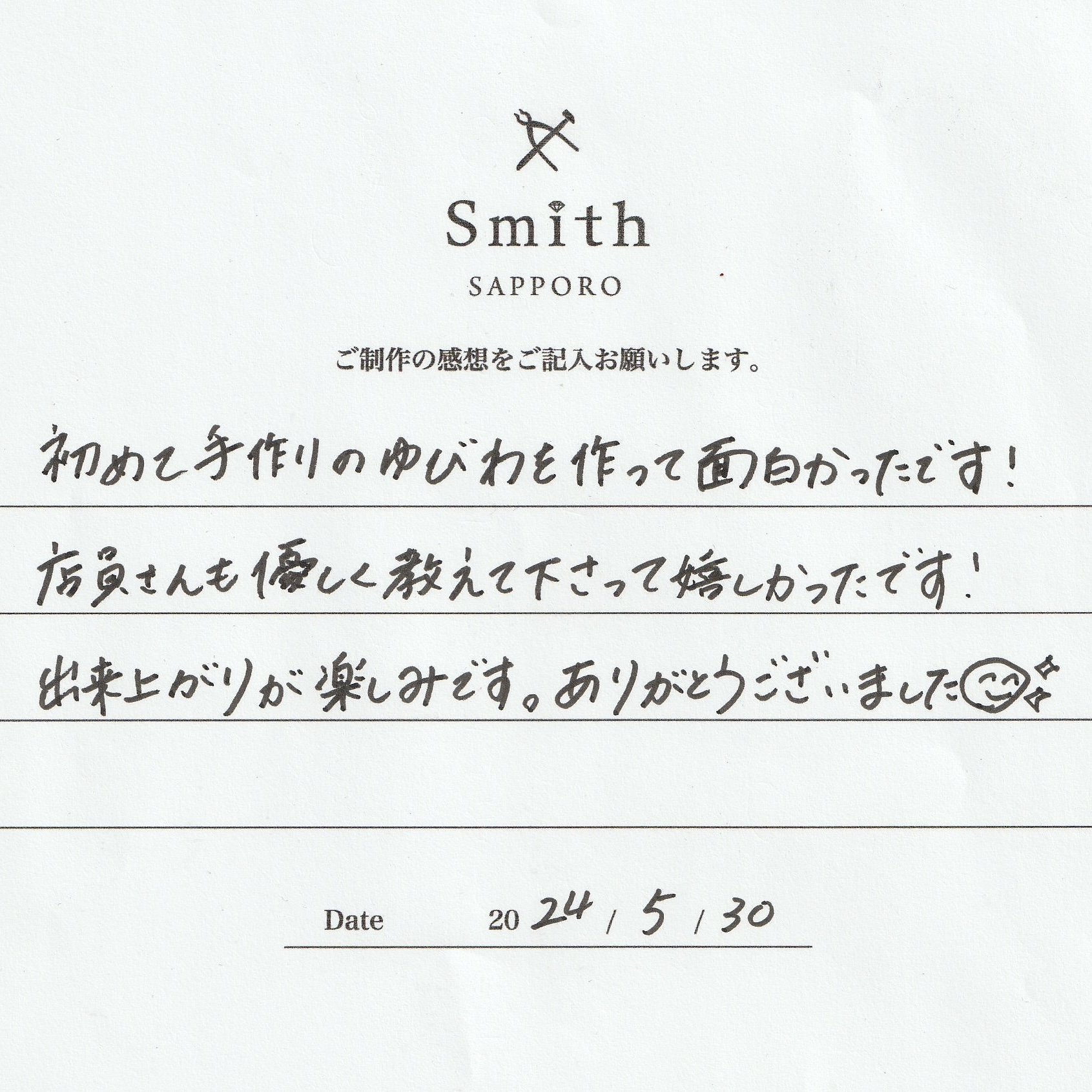 この度は、工房Smith京王プラザホテル札幌店で手作りペアリングのご制作誠にありがとうございました。
