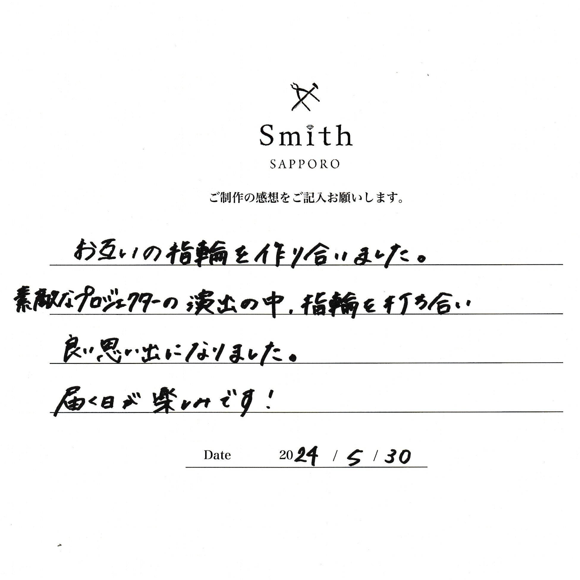 この度は手作り結婚指輪のご制作に工房スミス札幌店にお越しいただき、誠にありがとうございます。