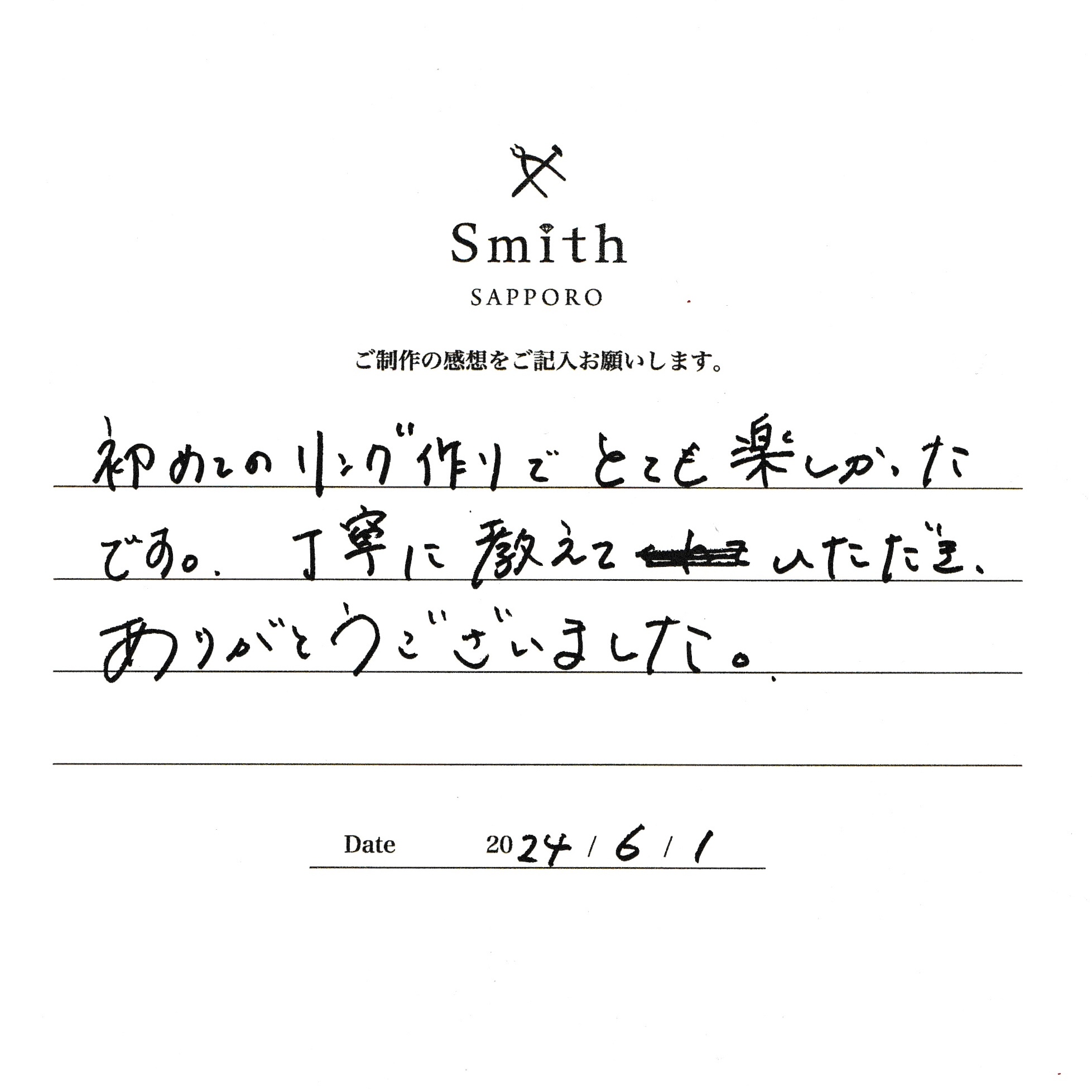 この度は、工房Smith京王プラザホテル札幌店で手作りペアリングのご制作誠にありがとうございました。