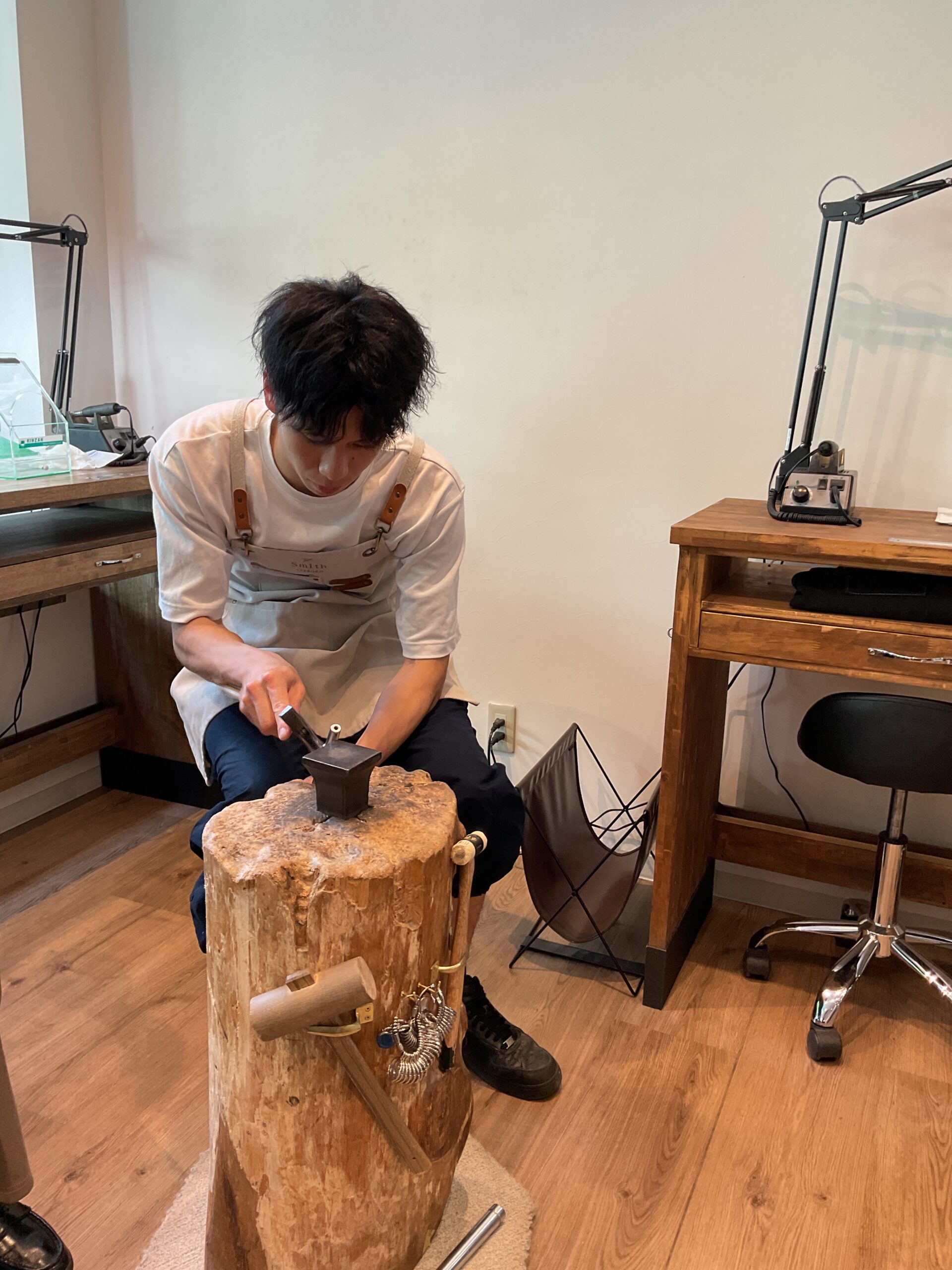 お二人が心を込めて制作されたリングは、オリジナルハンマーの模様が大人っぽいデザインのお揃いのペアリングになりました。