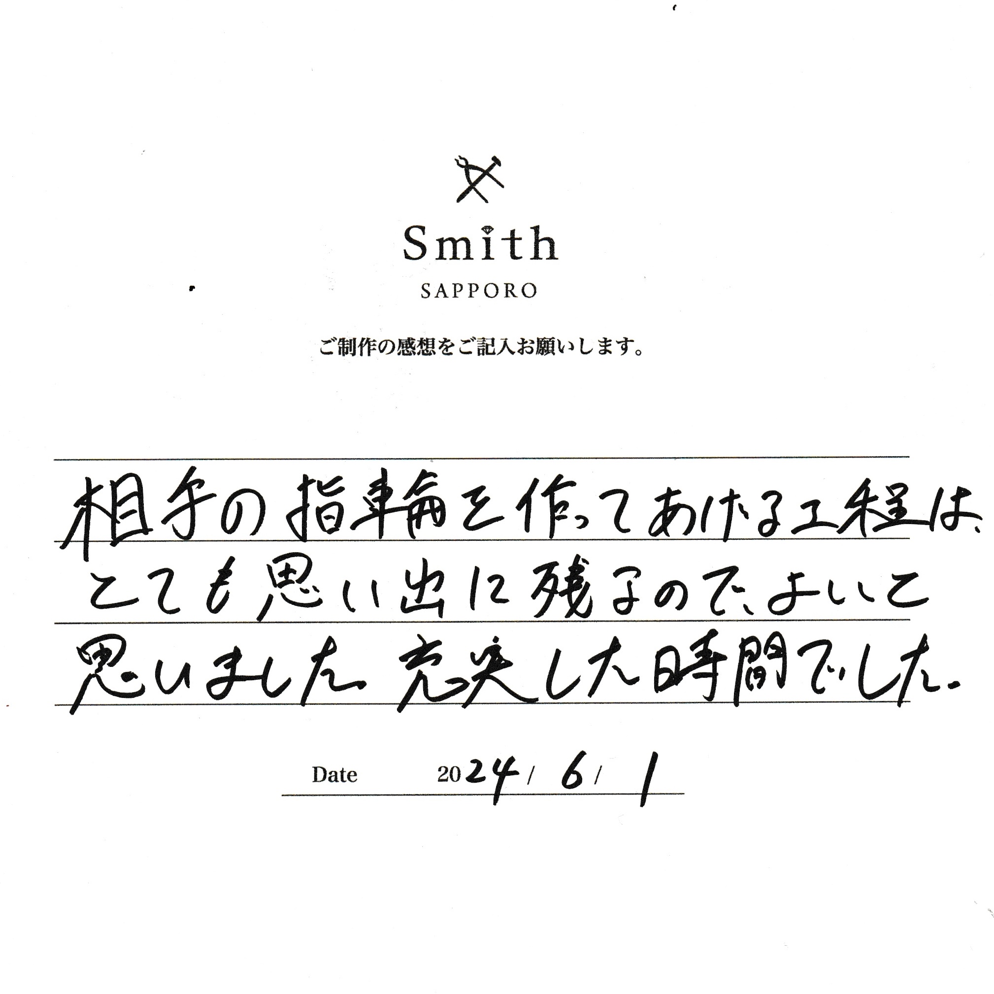 この度は、工房Smith京王プラザホテル札幌店で手作りペアリングのご制作誠にありがとうございました。